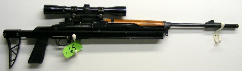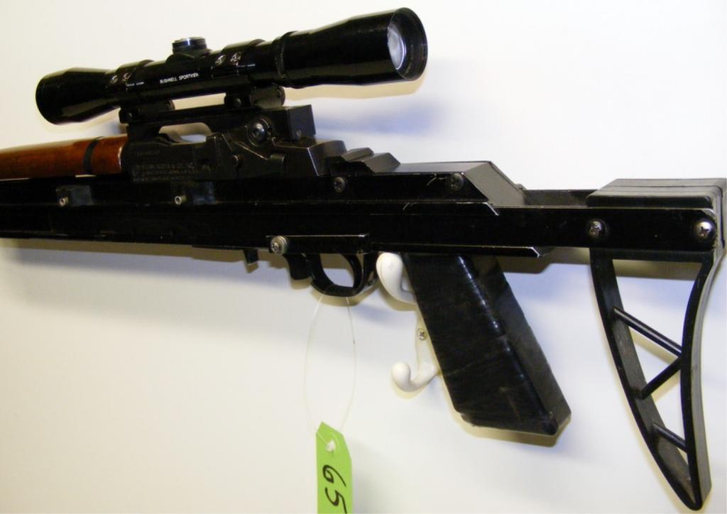 Ruger Mini 14 semi-auto rifle in 223. After market piece of junk collapsible stock that should be replaced before firing. Action is okay and bore is very dirty. Slip-on flash hider. No magazine. Bushnell scope is okay.