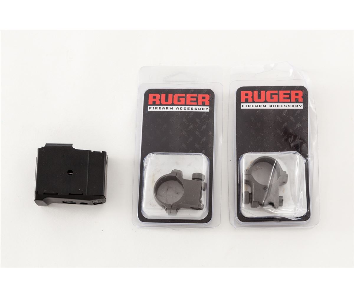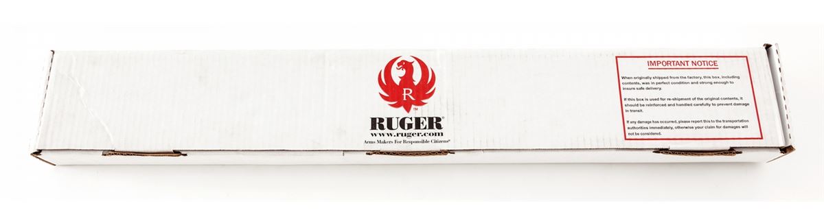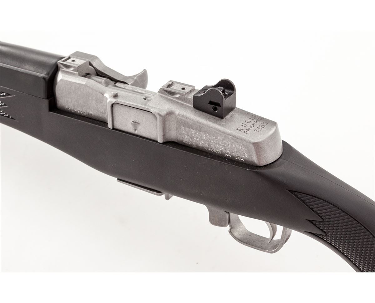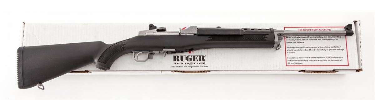 Ruger Mini-30 Semi-Automatic Ranch Rifle, #582-86611, 7.62x39 cal., 18-1/2'' barrel, stainless steel receiver and barrel, black checkered pistol-grip synthetic stock, aperture rear sight, sling swivels, with two (2) magazines, loose scope rings and Ruger gun lock, in original box with matching end label and owner's manual. Condition is excellent, remaining new and unfired, with very few light marks from handling. Box with moderate damage. Retails @ $899.95. Est.: $650-$900. (Modern) (Field Time)