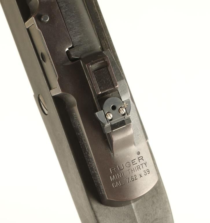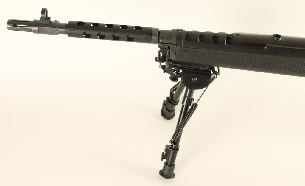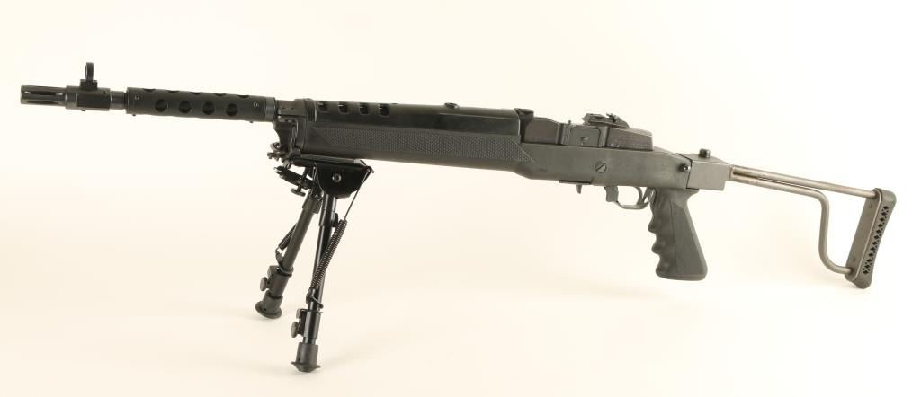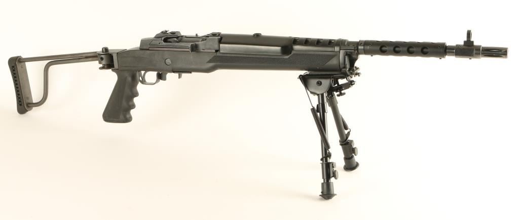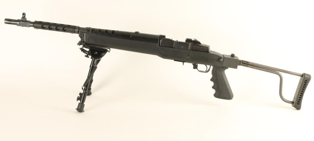 Paramilitary gas operated semi automatic sporting rifle chambered in 7.62x39mm, circa 1995. Features a blued finish, 18" barrel, aftermarket flash hider with large hooded front sight, ventilated barrel shroud, Harris bipod, flip-up rear aperture sight, integral scope mounts on receiver, black synthetic hand guard, manual safety, smooth trigger, and black synthetic Butler Creek pistol grip stock with folding shoulder stock. Includes the original factory wood stock. Finish shows little to no wear. Action is smooth, bore is very good, and stocks are fine. Condition is excellent. ***Modern Firearm***