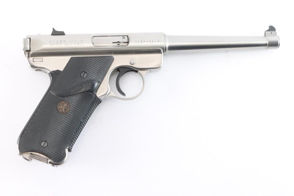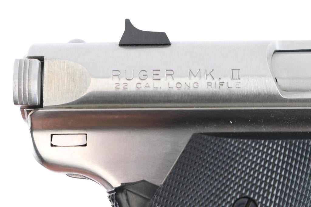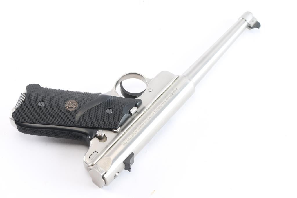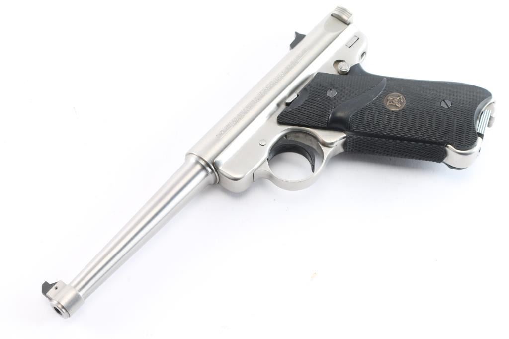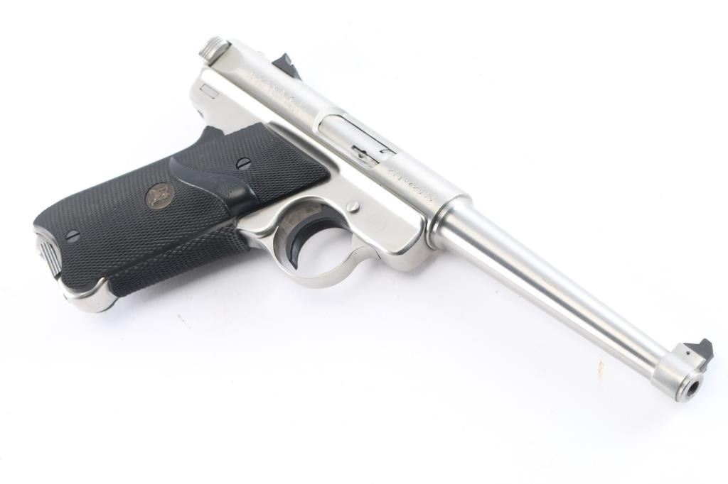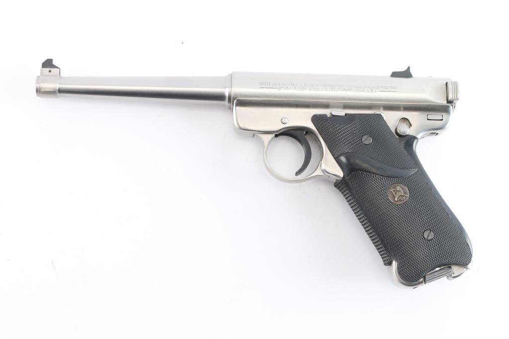 American made semi-auto rimfire pistol chambered for .22 Long Rifle ammunition, and manufactured circa 1985 in Southport, CT. It features a satin stainless finish, 6" tapered barrel, pinned raised blade front sight, fixed dovetailed square notched rear sight, serrated curved black trigger, smooth front strap, serrated bolt knob, serrated bolt stop, frame mounted annular cut manual safety, serrated heel magazine release, and Pachmayr checkered black rubber wrap-around grips with gold colored Pacmayr medallions. The original stainless finish retained is approximately 99% showing superficial blemishes. Metal displays no rust, or deformation. The action is smooth and crisp, and the bore is bright with strong rifling. The rubber grips are in excellent condition. Pistol includes one magazines total.