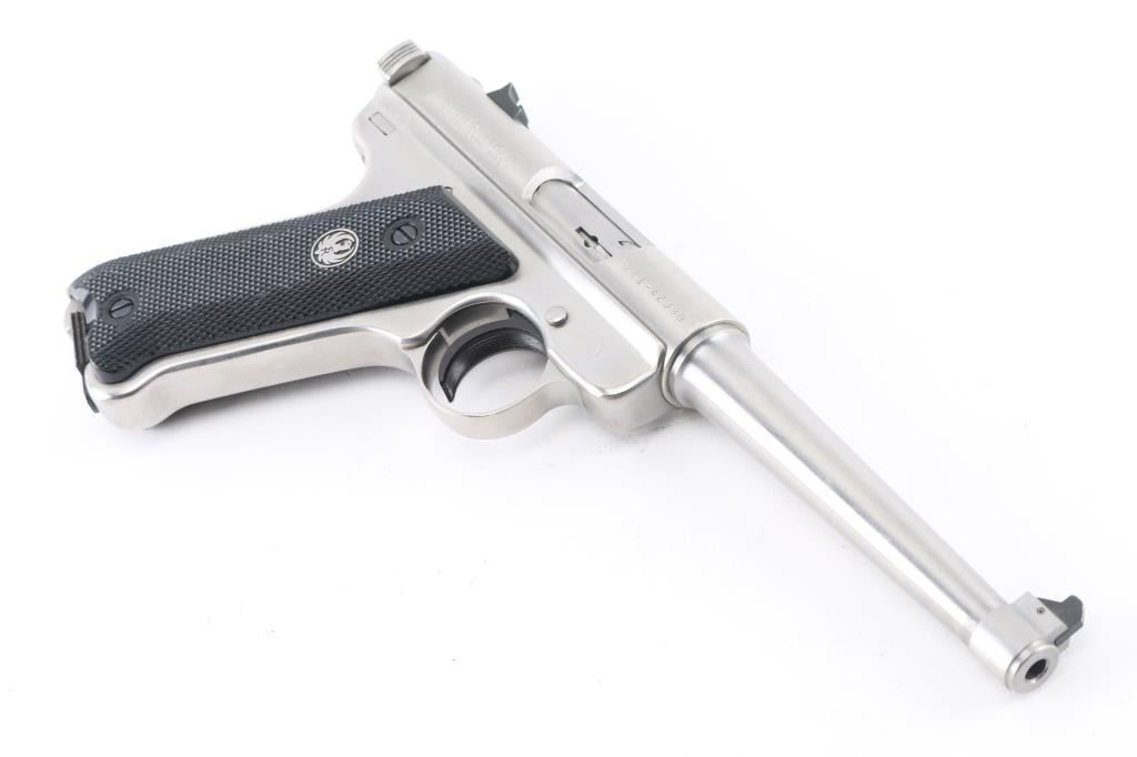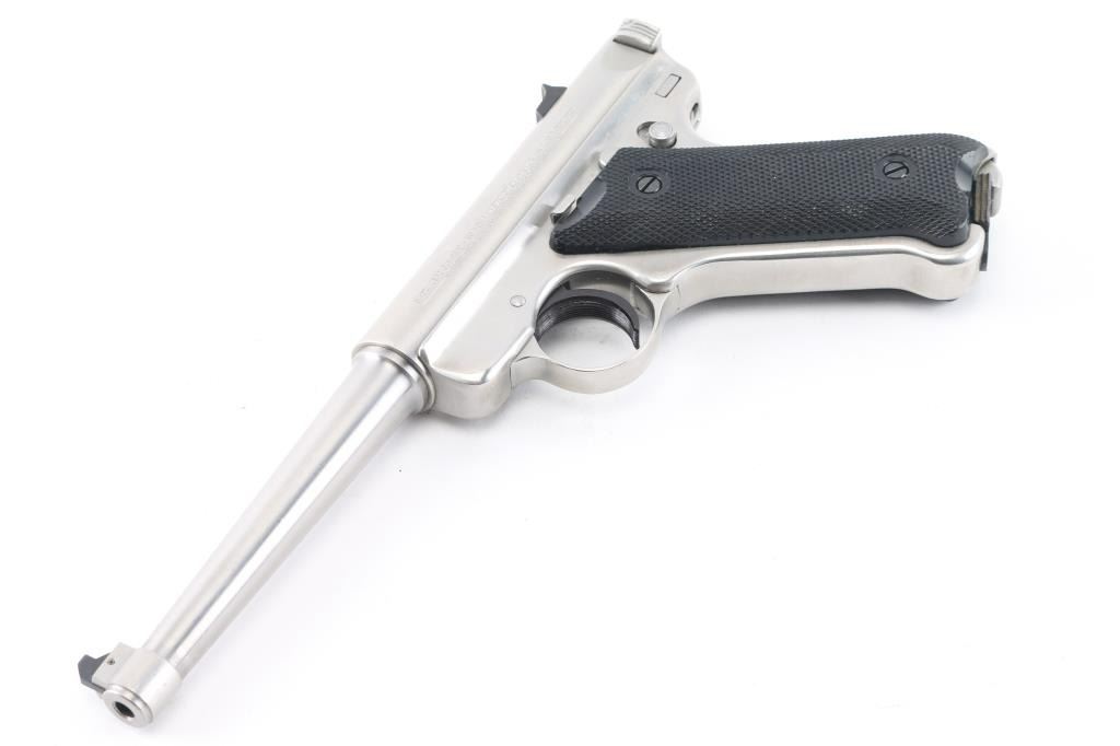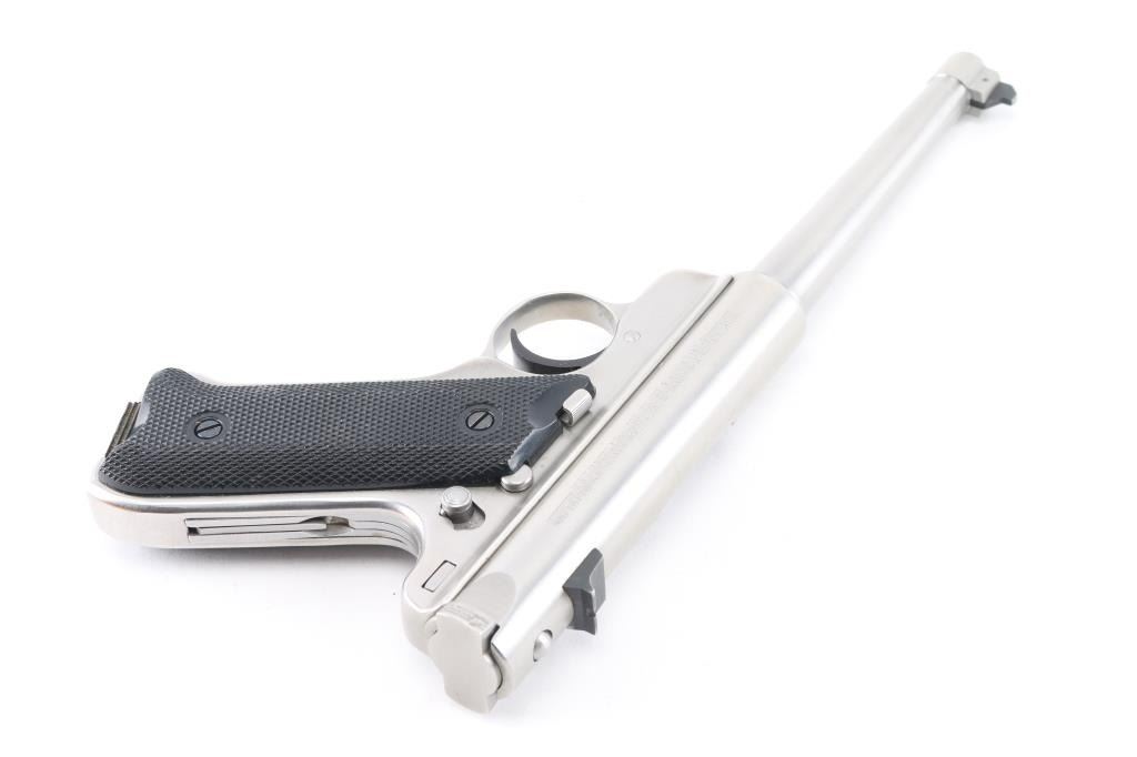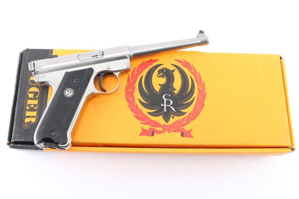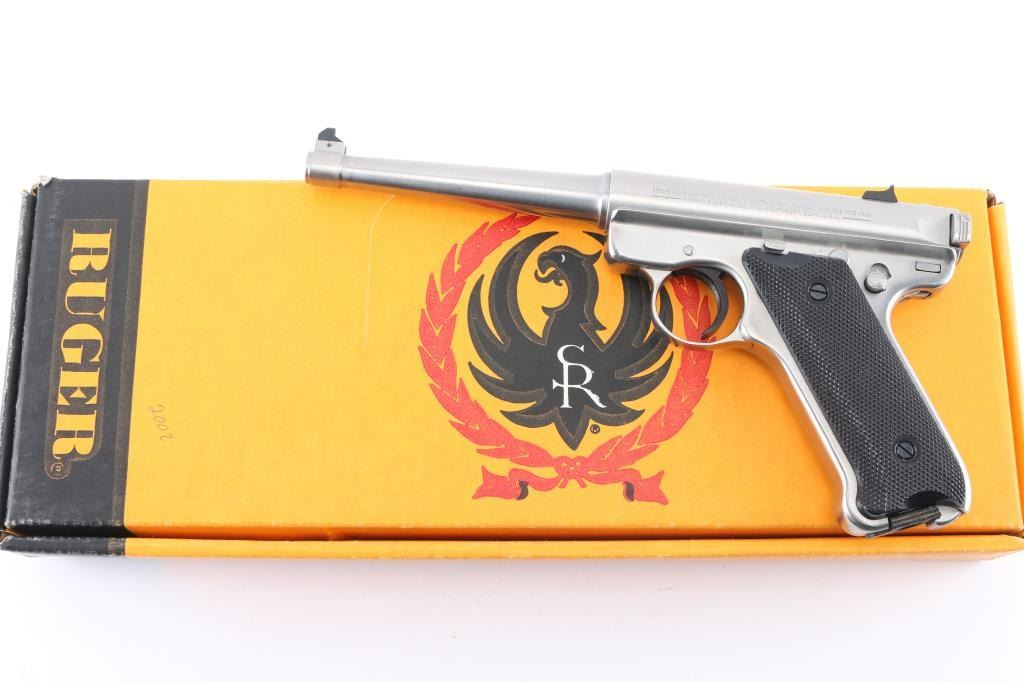 Semiautomatic rimfire pistol features stainless steel construction, blued trigger, 6" tapered barrel, fixed sights, manual safety, heel magazine release, checkered black plastic grips with black & silver Ruger medallion on right panel. Bore is very good condition. Overall excellent appearance, with light handling marks. Includes factory yellow cardboard box, manual, (2) magazines. Condition is NRA Excellent *** Modern Firearm ***