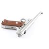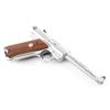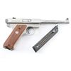 'National Rifle Association Limited Edition' Semiautomatic rimfire pistol features stainless steel construction, checkered wood grips with red/silver Ruger medallions, 6" tapered barrel, fixed front & dovetailed rear sights, heel magazine release, frame mounted manual safety, slide stop lever. Engraved on left side of barrel "National Rifle Association", on right side "Limited Edition 068 of 750", both in cursive script bordered & surrounded by limited cursive scrolls. Condition is like new with few signs of handling. Includes factory plastic box, spare magazine (2 total), manual. Condition is NRA Excellent - like new *** Modern Firearm ***