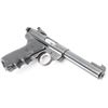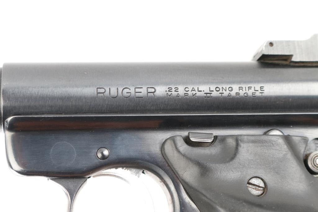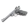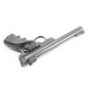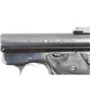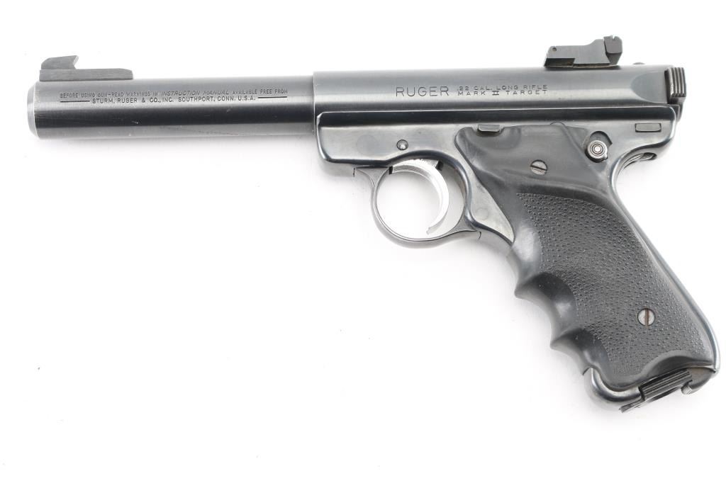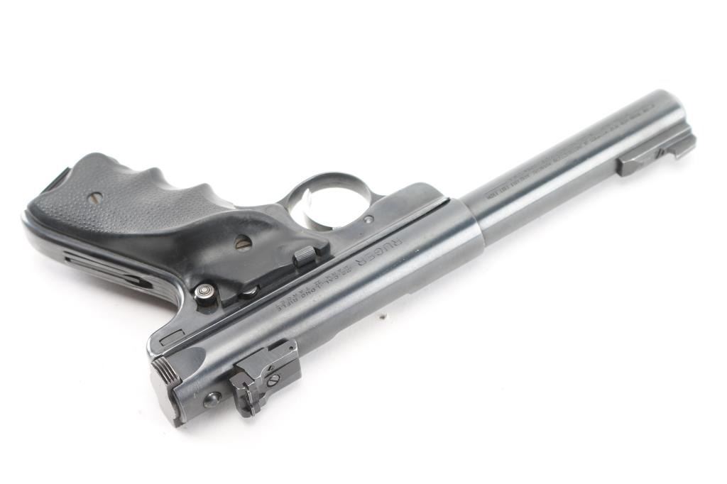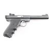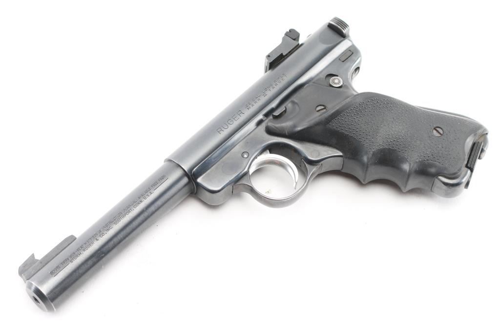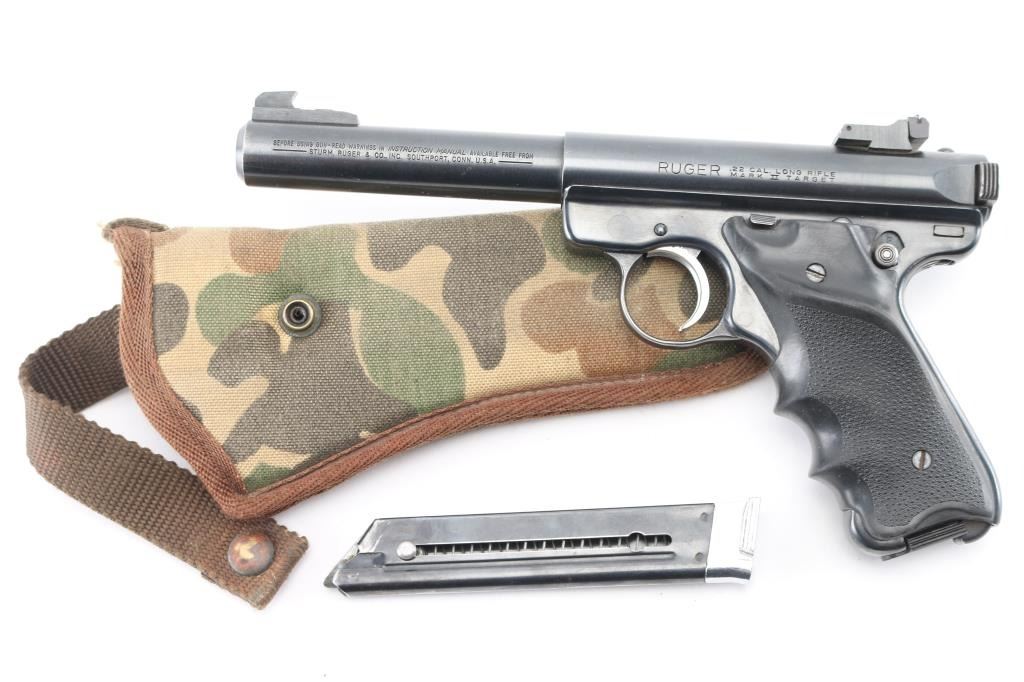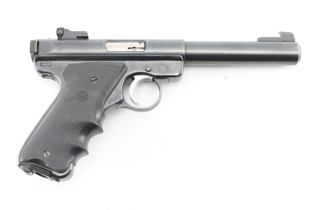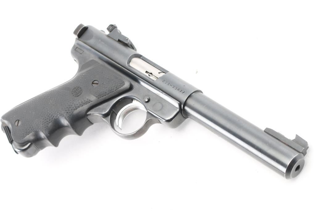 'Target Model' Semiautomatic rimfire pistol features blued finish, chrome accent serrated trigger, 5 1/2" round bull barrel, adjustable sights, manual safety, heel magazine release, pebbled black rubber Hogue grips with thumb rest. Condition is very good, few signs of handling, bore is excellent/bright. grips are excellent, blue is 96% with some minor scratches. Comes with two magazines. and camo nylon holster. Condition is Near Excellent. Modern Firearm.