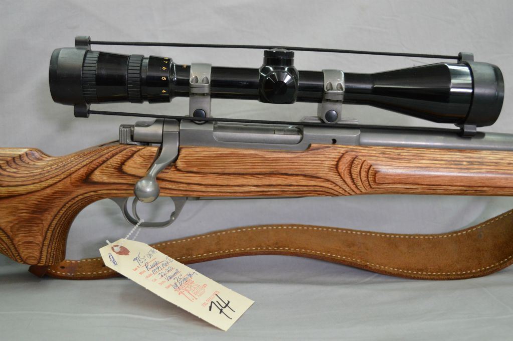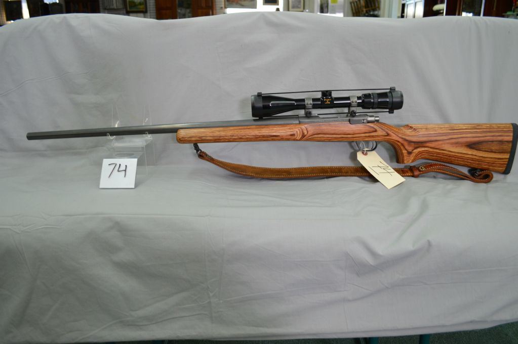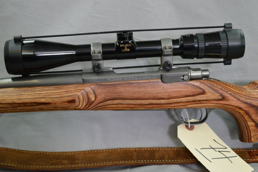Ruger Mod M77 Mark II Varmint .22-250 Rem cal bolt action Rifle w/ 26" bbl [ grey stainless finish, laminated pistol grip stock w/ recoil pad, Ruger rings, fitted w/ Bausch & Lomb Balvar 3 x 9 variable scope w/ plastic caps, & Toys for Boys Ruger marked leather sling w/quick off swivels ] Ser # 78506765