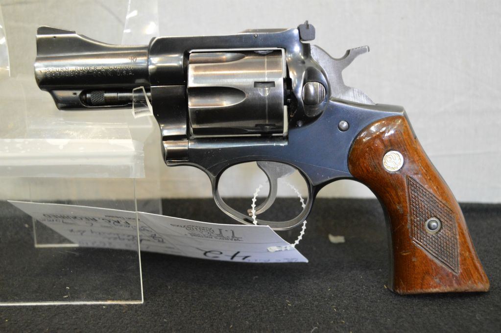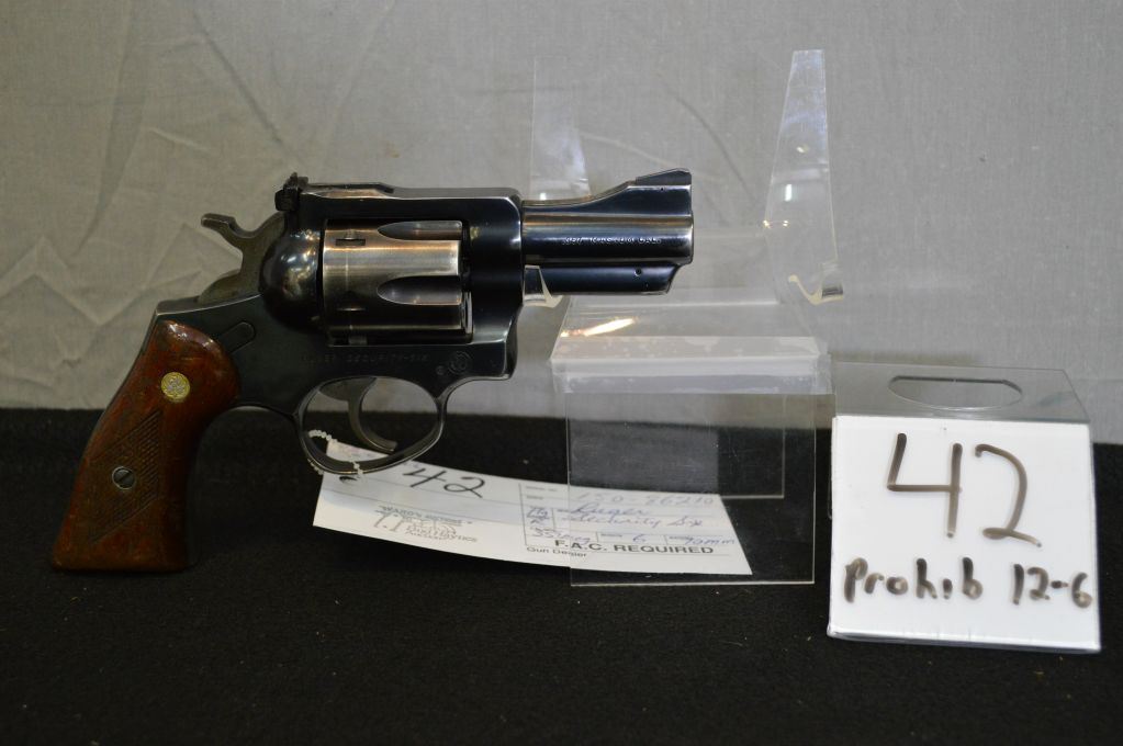 Ruger Mod Security Six .357 Mag cal 6 shot Revolver w/ 70 mm bbl [ blued finish, adjustable rear sight, shows holster wear, also wear to trigger guard, front & back strap & cylinder ring, worn checkered Ruger insignia grips ] Ser # 15086210 12-6 Prohib Cert # TCI