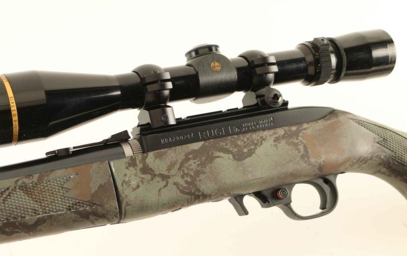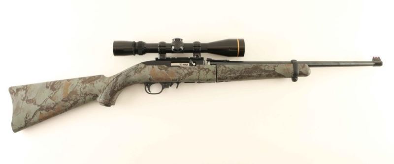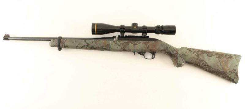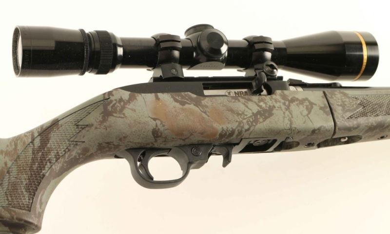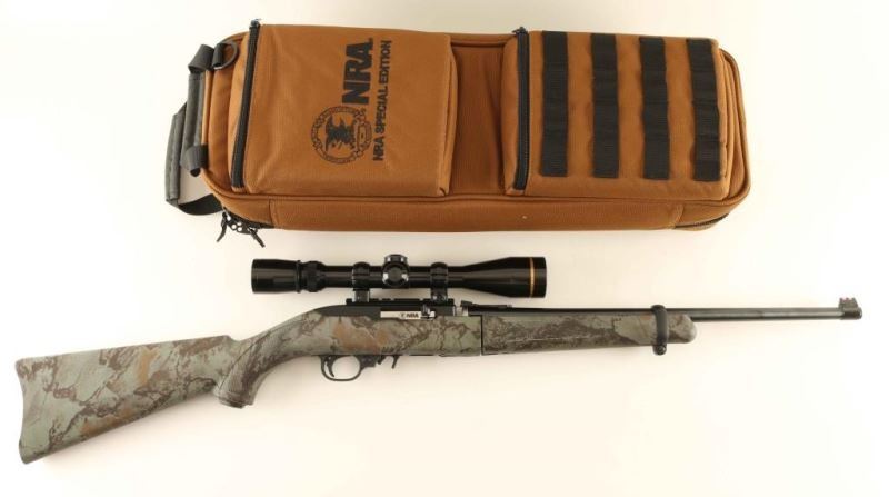 'NRA Special Edition' Blowback operated semi-automatic sporting rifle chambered in .22 Long Rifle. Features a blued 18.5" take-down barrel, dovetailed red HiVis front sight, Williams elevation adjustable two-dot green HiVis rear sight, Leupold Vari-X 3.5x10 40mm scope, textured trigger, smooth charging handle, push button safety, factory 10 round rotary magazine, NRA marked bolt, bolt hold open lever, black finished alloy receiver, checkered Natural Gear camouflage synthetic forend and pistol grip shoulder stock. Includes the original factory cardboard box with compact brown Cordura carry case, shoulder strap, spare magazine and lock. Rifle exhibits approximately 98% of it's original finish showing minor edge wear and a few light handling marks. Action is smooth, bore is excellent, optics are sharp and the synthetic stocks are near fine with light scattered wear. Condition is near NRA Excellent in box. ***Modern Firearm***