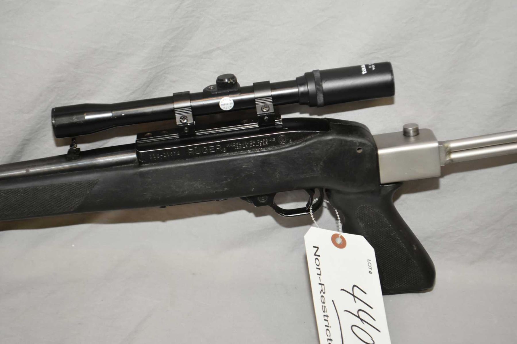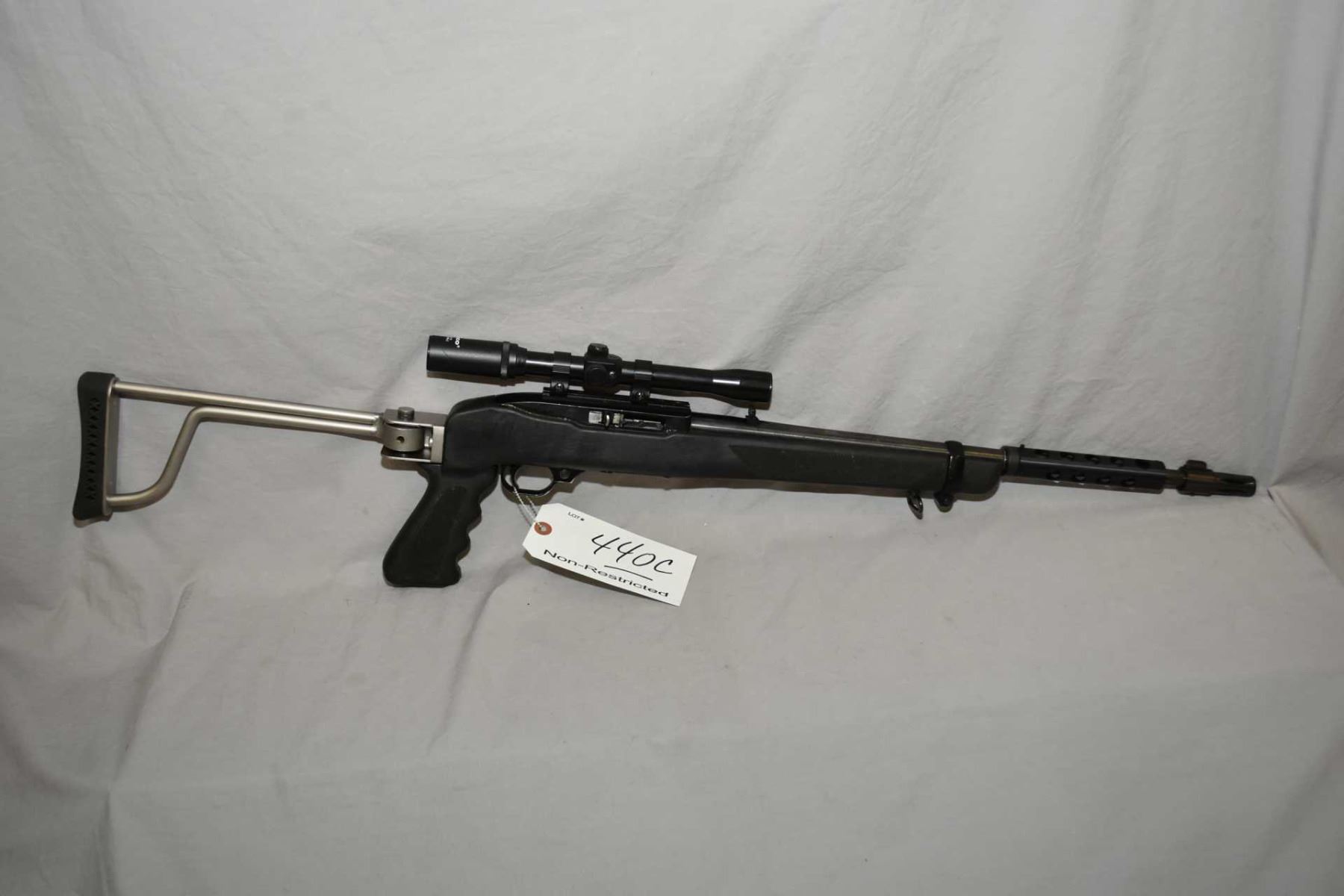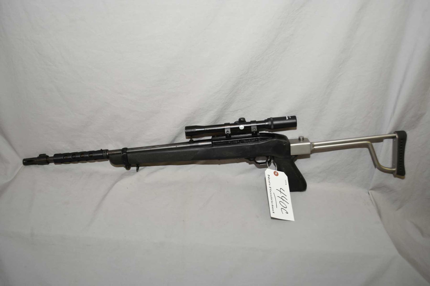 Ruger Model 10 - 22 Carbine .22 LR Cal Mag Fed Semi Auto Rifle w/ 18 1/2" bbl [ blued finish, barrel sights, also fitted with Tasco 4 x 20 Scope, vented barrel shroud, with muzzle break, composite pistol grip stock, and stainless folding rod style butt stock w/ recoil pad ] Ser # 118 - 11 - 672