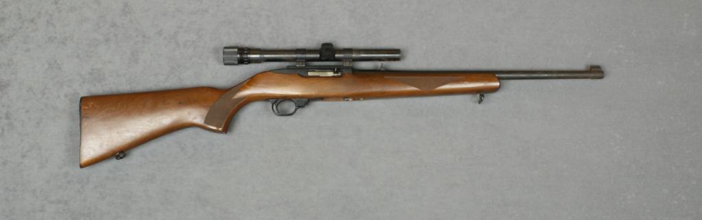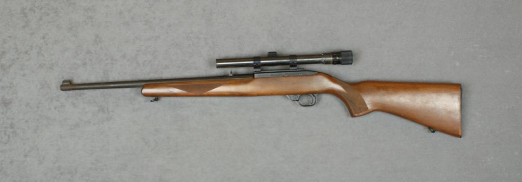 Ruger Model 10/22 semi-auto carbine, .22LR cal., 18-1/2” barrel, black finish, checkered wood stock, no magazine, #119-09315. This gun is in overall very good uncleaned condition showing considerable originalfinish with scattered surface rust at the muzzle area, very good bore, action, markings and wood; sling swivels and mounted Weaver sight with good optics. Est.: $250-$450.
