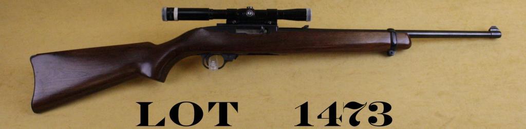 Ruger Model 10/22 semi-auto carbine, .22LR cal., 18-1/2” barrel, blue finish, plain wood stock, no magazine, #104200. This gun is in overall very good condition showing the majority of its original finish, bore shouldclean to very good, good action and markings, very good wood stock with a couple of mars and dings from storage; mounted with an unmarked scope displaying very good optics. Est.: $100-$200.