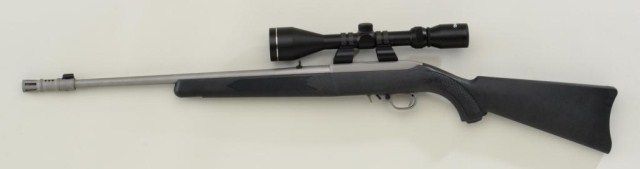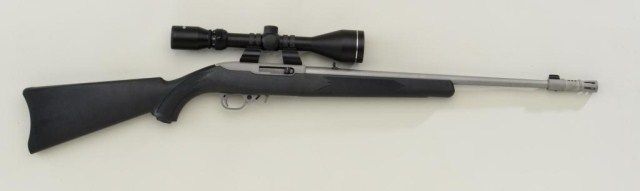 Ruger Model 10/22 semi-auto carbine, .22LR cal., 21” barrel including muzzle break, satin finish, checkered black composite stock, #352-93414, mounted with a Tasco adjustable scope with fine optics, withfactory cardboard shipping box. This gun is in overall very good to fine condition with a fine bore, crisp action, and fine light weight stock. Est.: $300-$500.