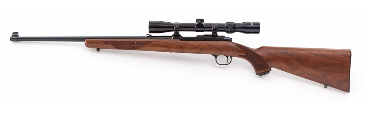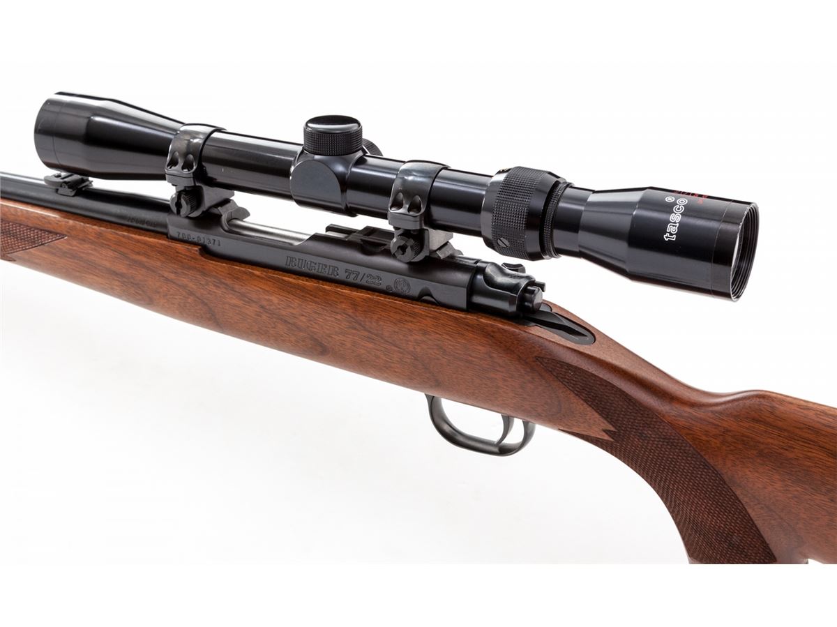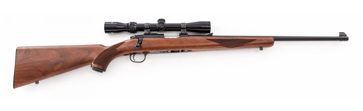 Ruger Model 77/22 Bolt Action Rifle, #700-01371, .22 LR cal., 20'' barrel, blue finish, checkered pistol-grip walnut stock, Ruger buttplate, with one original Ruger magazine. Topped with a Tasco 3-9x32 scope. Condition is excellent retaining approx. 99% blue, metal surfaces with light marks from handling, stock with a few impressions and small scratches. Action is crisp, bore is bright, optics are clear. Est.: $450-$650. (Modern)