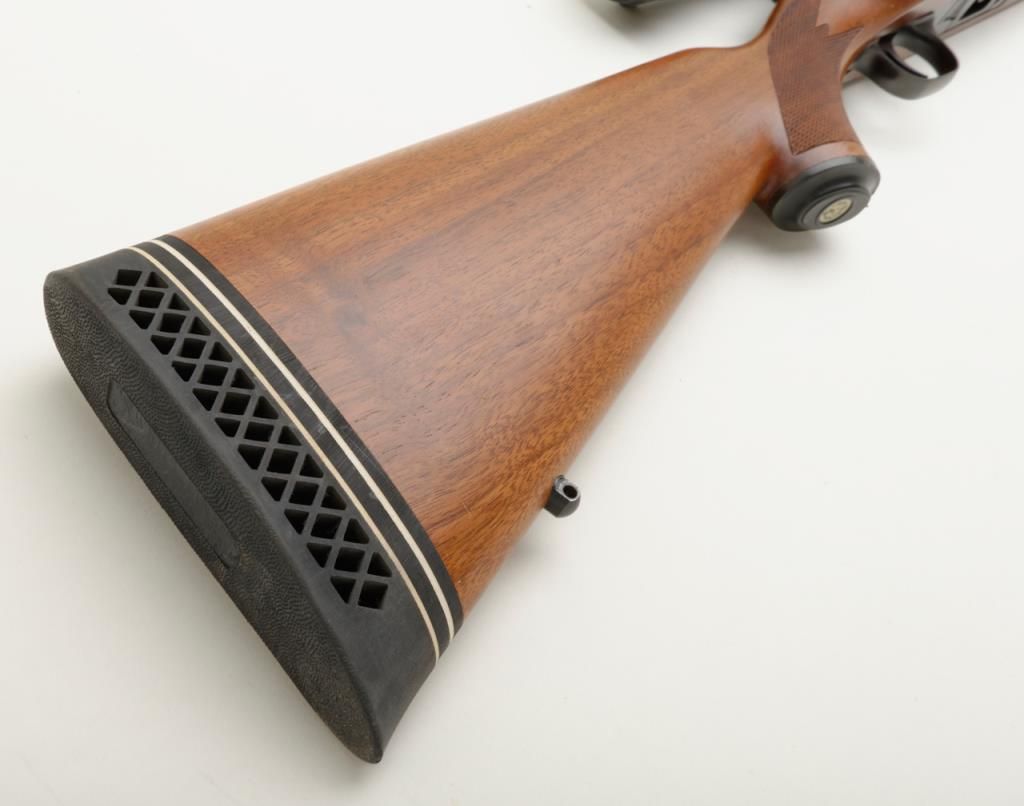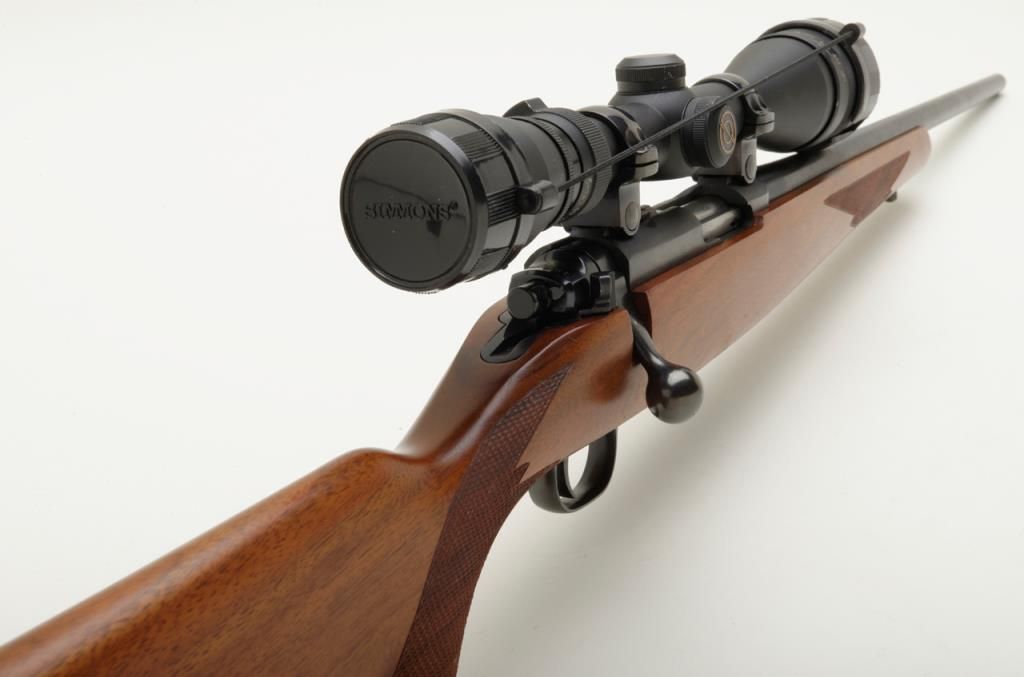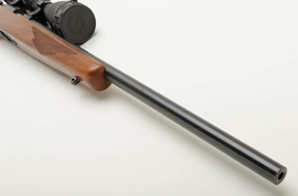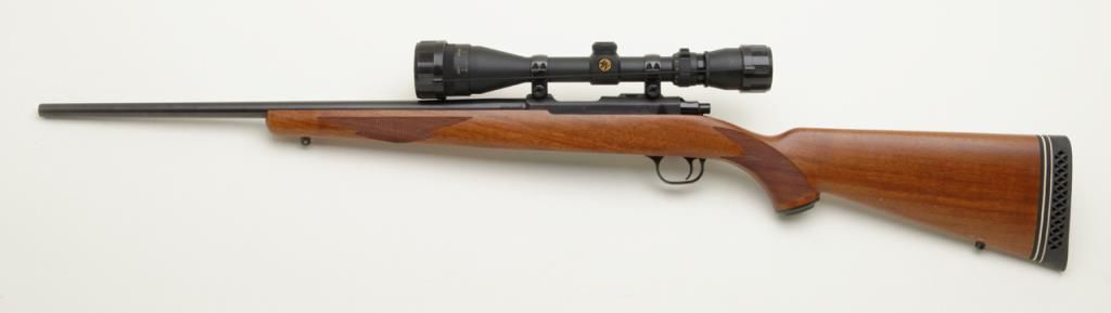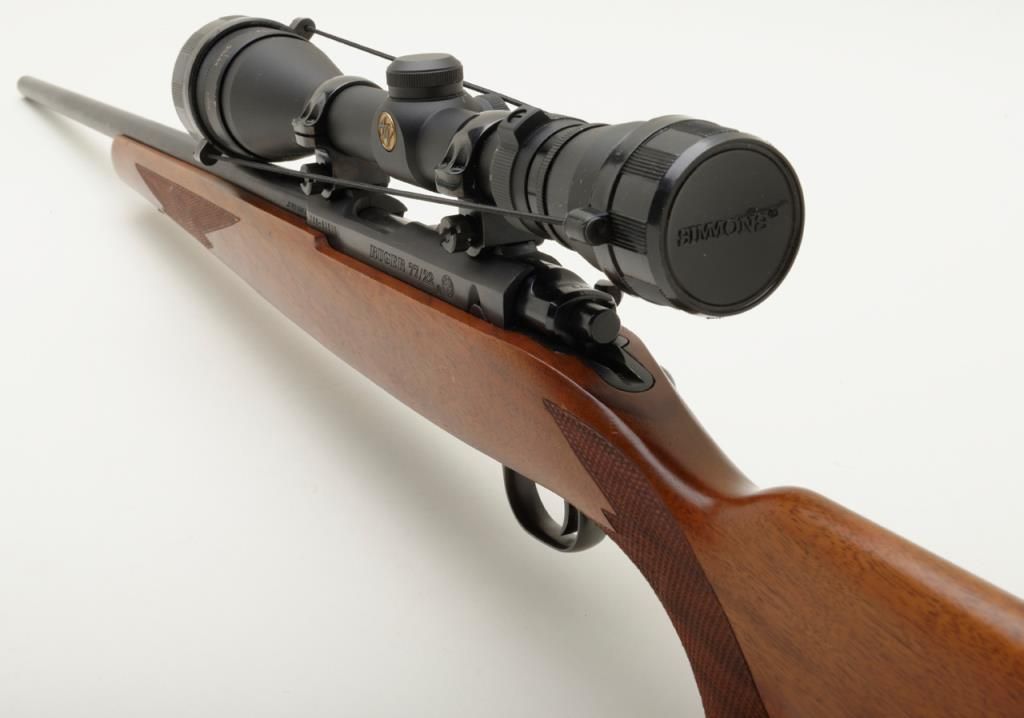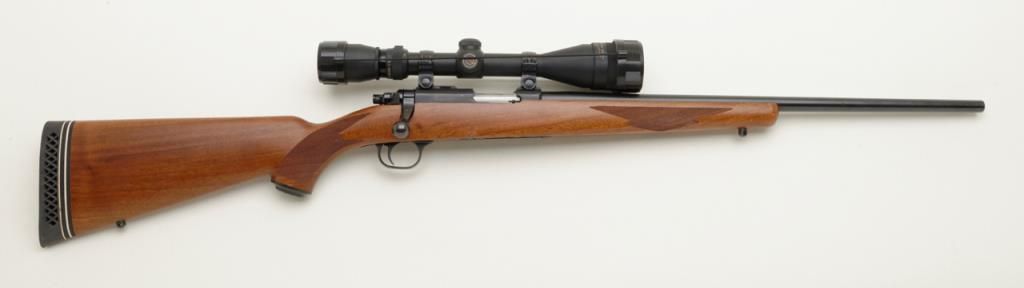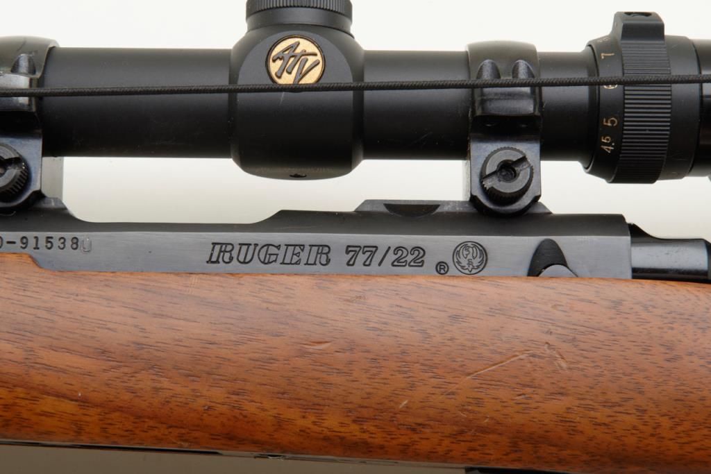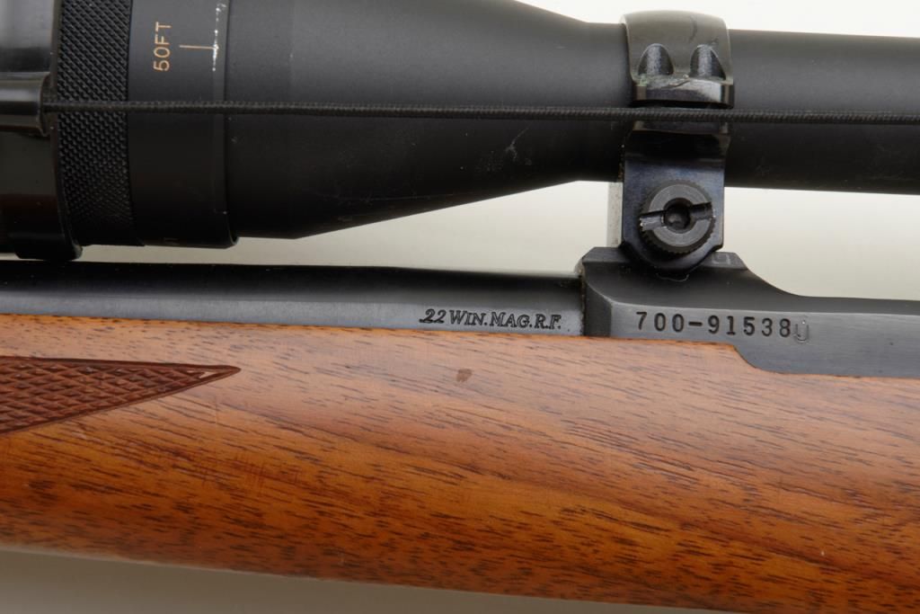 Ruger Model 77/22 bolt action rifle, .22 Win. Mag. R.F. cal., 20” barrel, blue finish, checkered wood stock, #700-91538, mounted with a Simmons 4.5-14X40 Variable scope with sharp optics. This gun is in overall fine condition with a fine bore, action, markings and stock. (Modern/PPT). Est.: $300-$600.