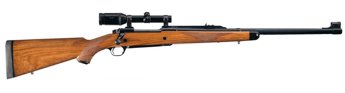 Introduced in 1993. Hooded bead and V-notch express rear sights. Mounted with a Swarovski Nova 1.5 - 4.5 X 20 scope. The bolt handle has five panels checkered with a floral scroll patten engraved on the end. Standard markings and features of the model. Fitted with a deluxe Circassian walnut checkered straight comb pistol grip stock with sling swivels, an ebony end cap, steel grip cap and a Decelerator recoil pad.