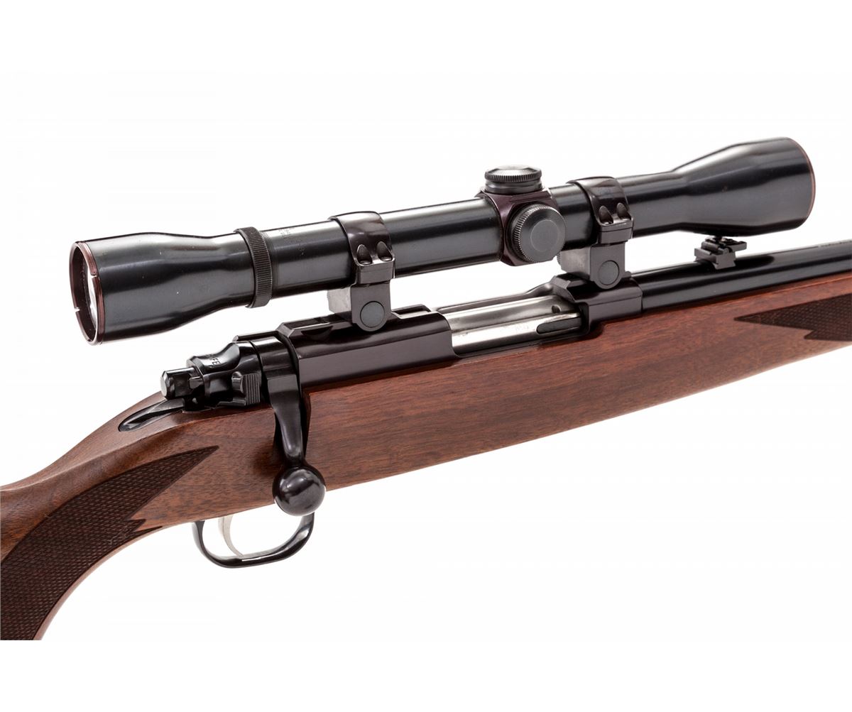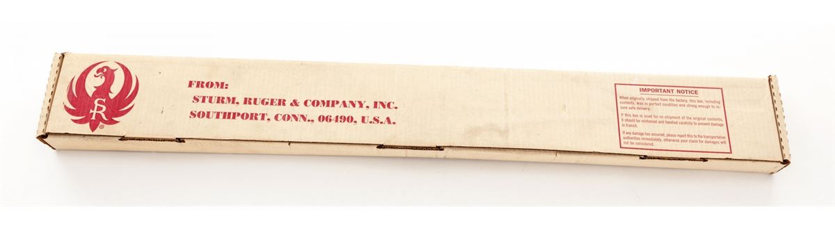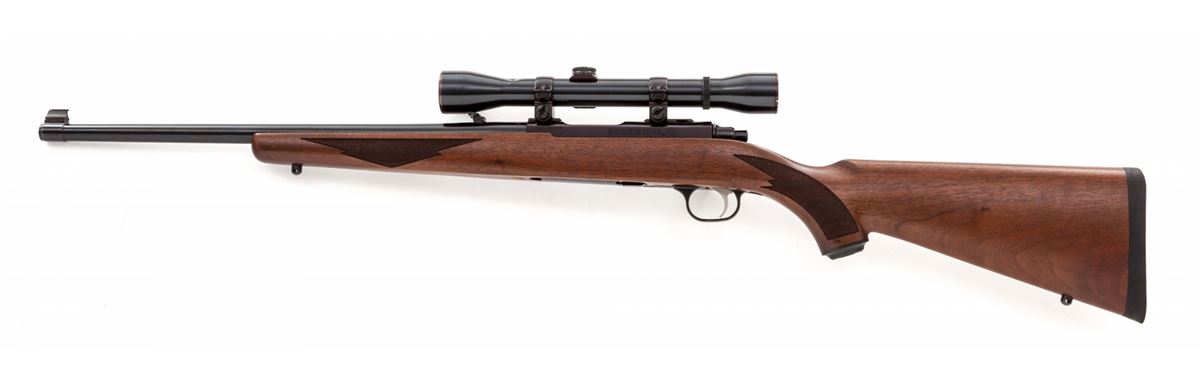 Ruger Model 77/44 Bolt Action Carbine, #740-01550, .44 mag. cal., 18'' barrel, blue finish, factory checkered walnut stock. Topped with a Weaver K4 scope on Ruger rings. Condition is about fine showing just light marks from handling. Small dent to forward portion of scope tube which does not affect field of view. Action is good, bore is bright, scope optics with crosshair reticule are clear. With original box. Est.: $500-$750. (Modern)
