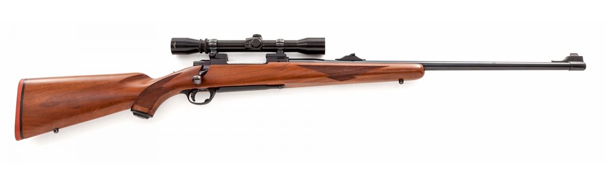 Ruger Model 77 Bolt Action Rifle, #70-56573, .257 Robts. cal., 24'' barrel, blue finish, checkered walnut stock. Topped with a Herter's 3-7x31 scope, on Redfield rings and mounts. Condition is fine retaining approx. 98% blue with light areas of scattered pitting on barrel. Stock shows light to moderate marks from handling. Good action, bright bore, scope with clear crosshair optics. Est.: $600-$800. (Modern)