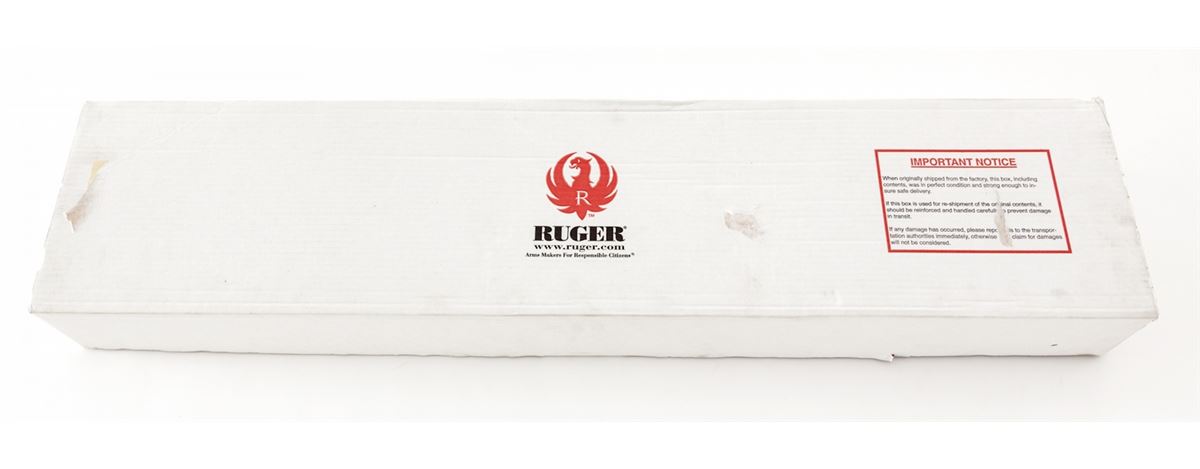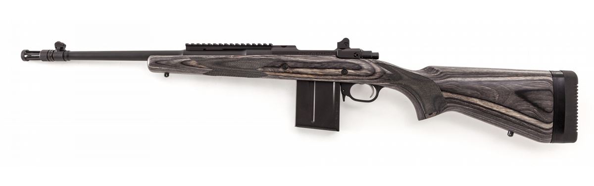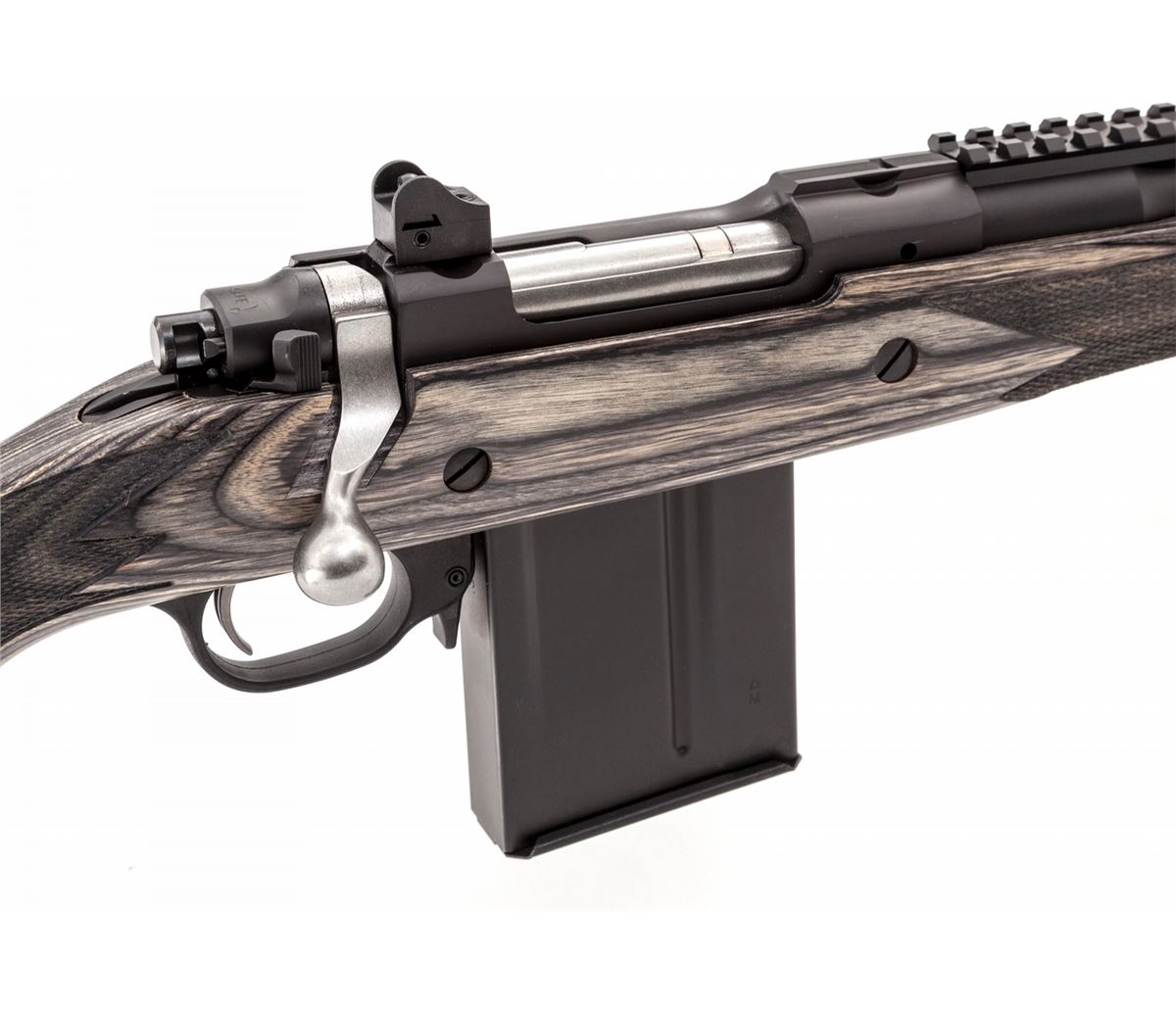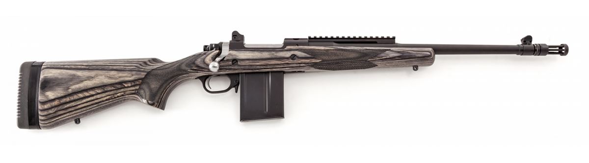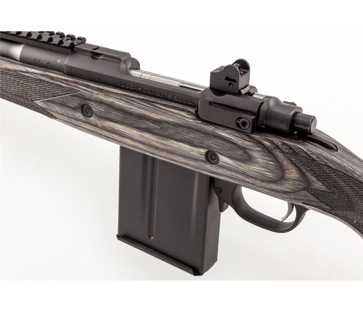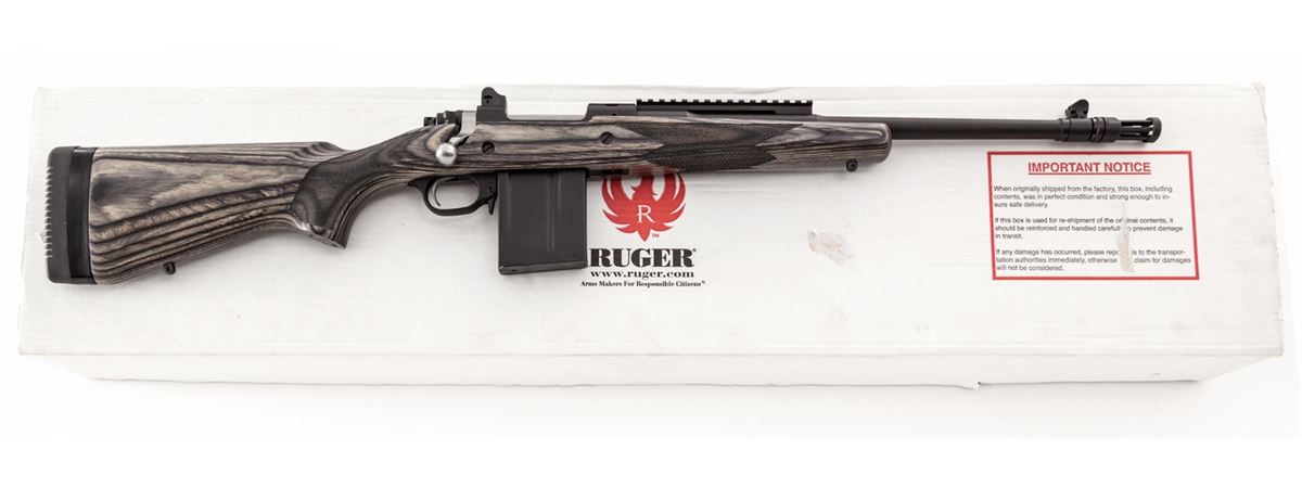 Ruger Model 77 Gunsite Scout Bolt Action Rifle, #680-58781, .308 Win. cal., 16-1/2'' barrel with flash suppressor, matte blue finish, checkered gray laminate pistol grip stock, recoil pad, adjustable ghost ring rear sight, blade front sight, Picatinny rail, with one (1) magazine, gun lock and loose scope rings, in box with matching end label and owner's manual. Condition is excellent, remaining new and unfired. Retails @ $919.95. Est.: $600-$800. (Modern) (Field Time)
