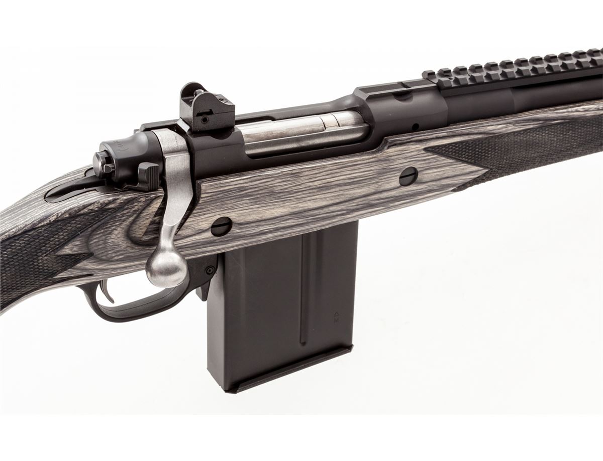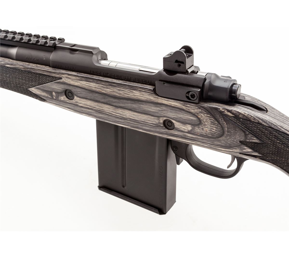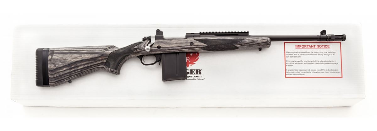 Ruger Model 77 Gunsite Scout Bolt Action Rifle, #680-60702, .308 Win. cal., 16-1/2'' barrel with flash suppressor, matte blue finish, checkered gray laminate pistol-grip stock, recoil pad, adjustable ghost ring rear sight, blade front sight, Picatinny rail, with one (1) magazine, gun lock and loose scope rings, in box with matching end label and owner's manual. condition is excellent, remaining new and unfired. Retails @ $919.95. Est.: $600-$800. (Modern) (Field Time)