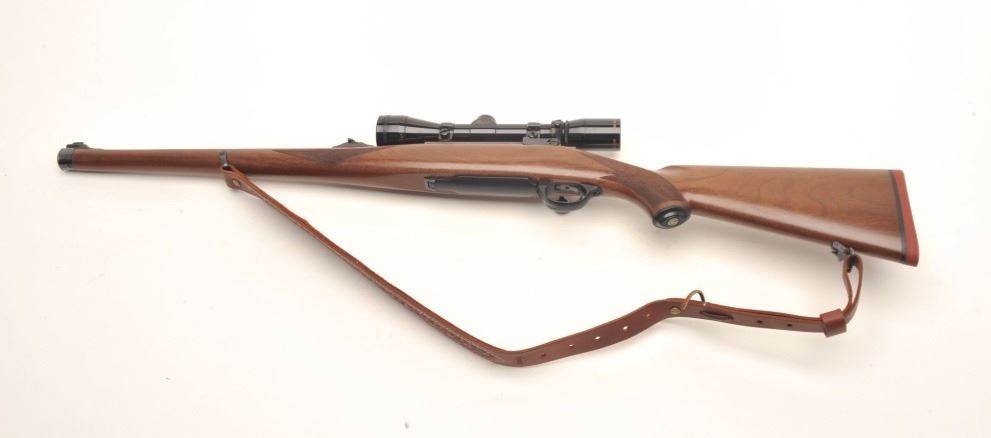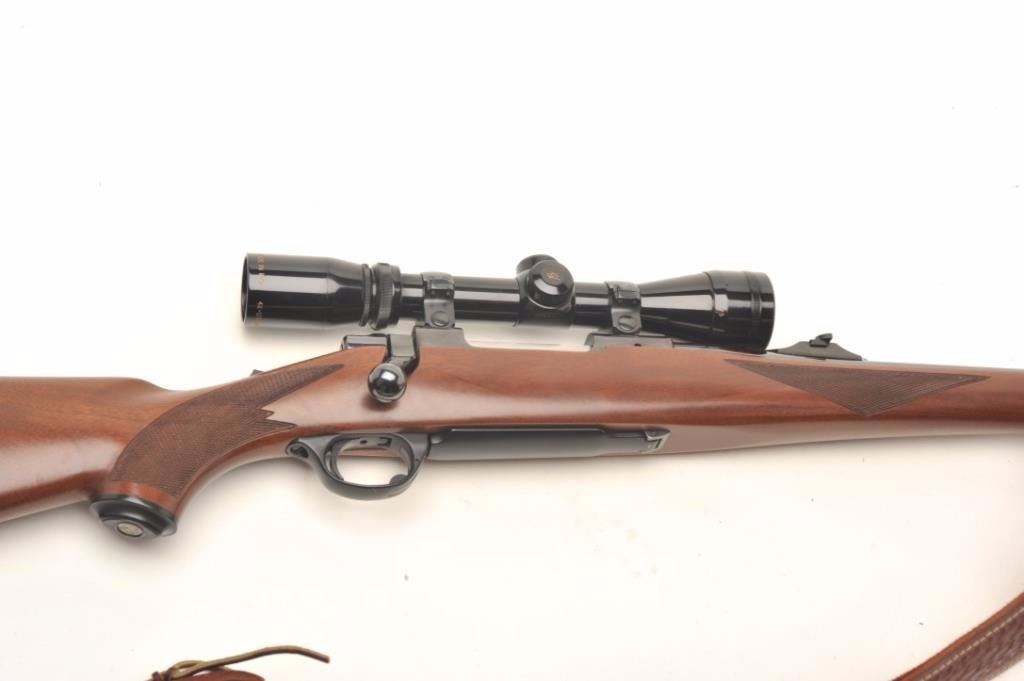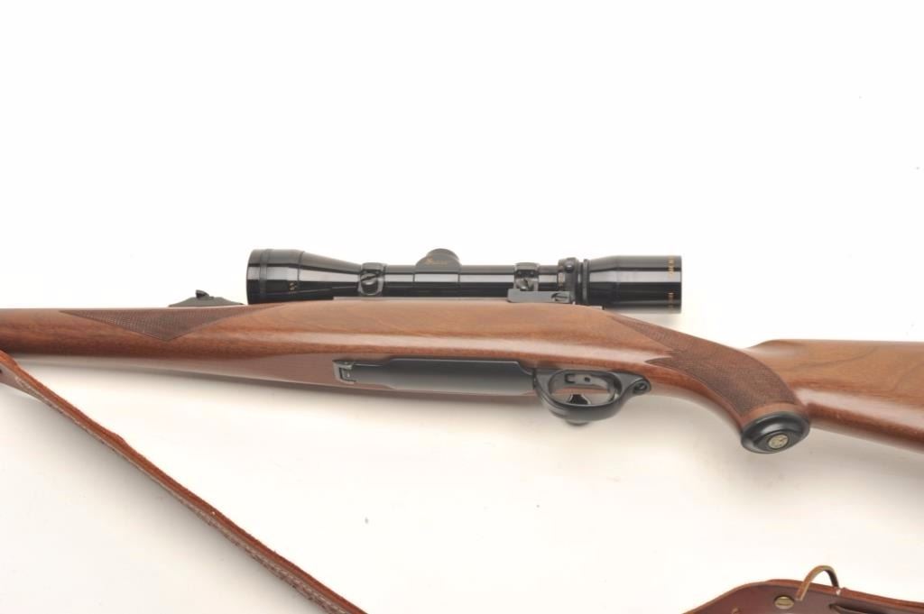 Ruger Model 77 bolt action rifle, .22-250 caliber, 18.5” barrel, blued finish, Mannlicher style checkered wood stock, leather sling, S/N 78-27072, mounted with a Burris 4X-12X Mini scope with fine optics, in overall fine condition with bright bore, crisp action and markings, fine stock. (Modern). Est.: $800-$1,600.