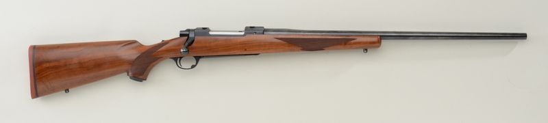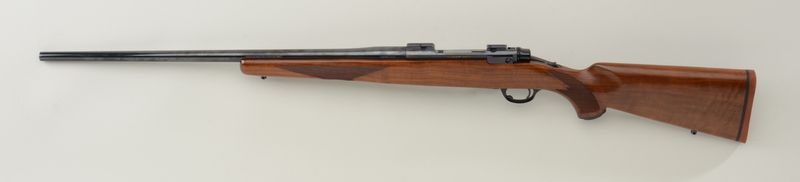 Ruger Model 77 bolt-action rifle, .338 Win. Mag. cal., 24-1/2” round barrel, blue finish, checkered wood stock, #71-83189. This gun is in overall fine condition showing the majority of its original finish, fine bore,crisp action, sharp markings including “Made in the 200th Year of American Liberty” on the left side of the barrel; fine stock with sling swivel eyelets and red hard rubber butt pad. Est.: $600-$900.