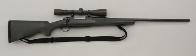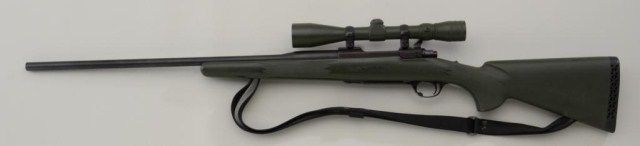 Ruger Model 77 bolt-action rifle, 6mm Rem. cal., Redfield 3x9 scope, neoprene stock, matt finish, #72-03989; very good to near fine used condition; normal wear and use; stock and finishes probably custom or dealeradded. Est.: $350-$700.