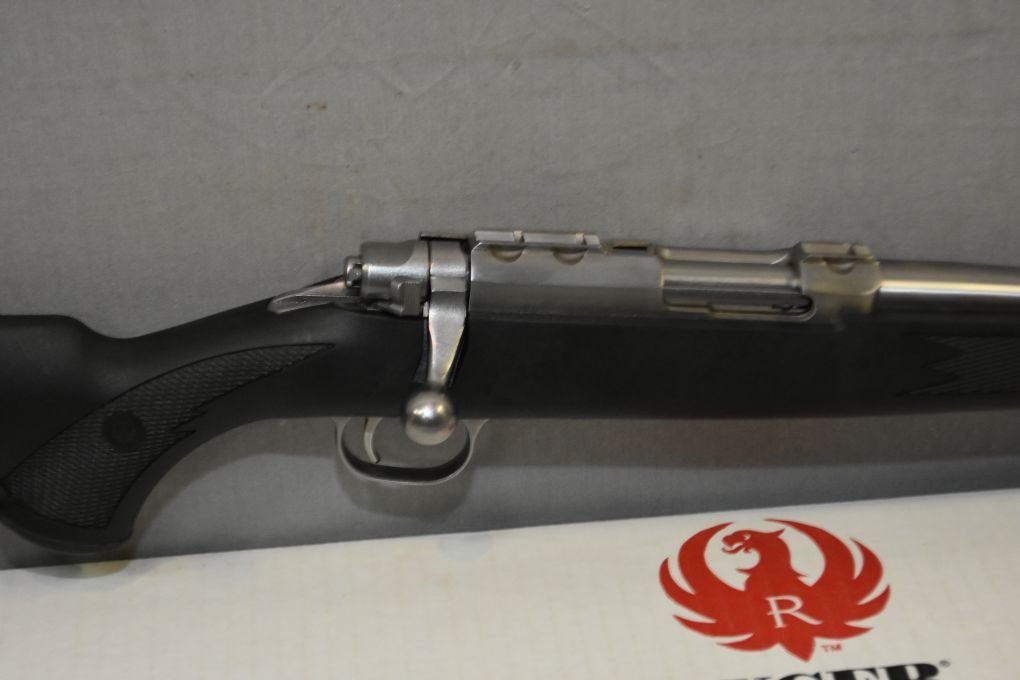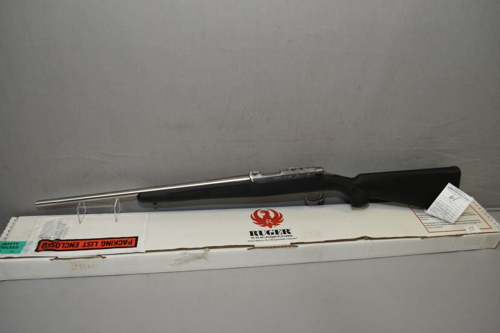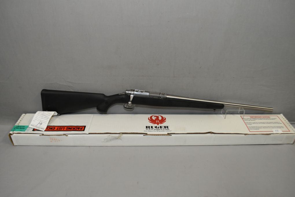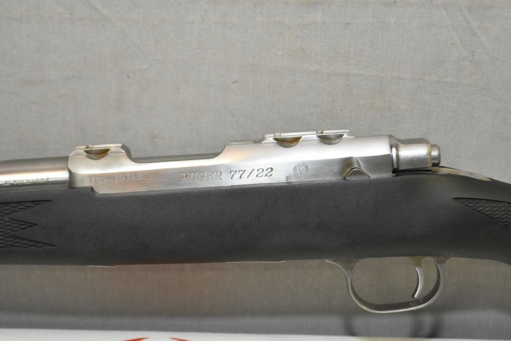 Ruger Model 7722 Stainless Synthetic .22 Win Mag Rimfire Cal Mag Fed Bolt Action Rifle w/ 20" bbl [ appears as new in orig box w/booklet, stainless steel Ruger rings, Ruger lock & keys, stainless steel finish, no barrel sights but has integral base, black composite pistol grip stock w/recoil pad ] Ser # 703 - 75168