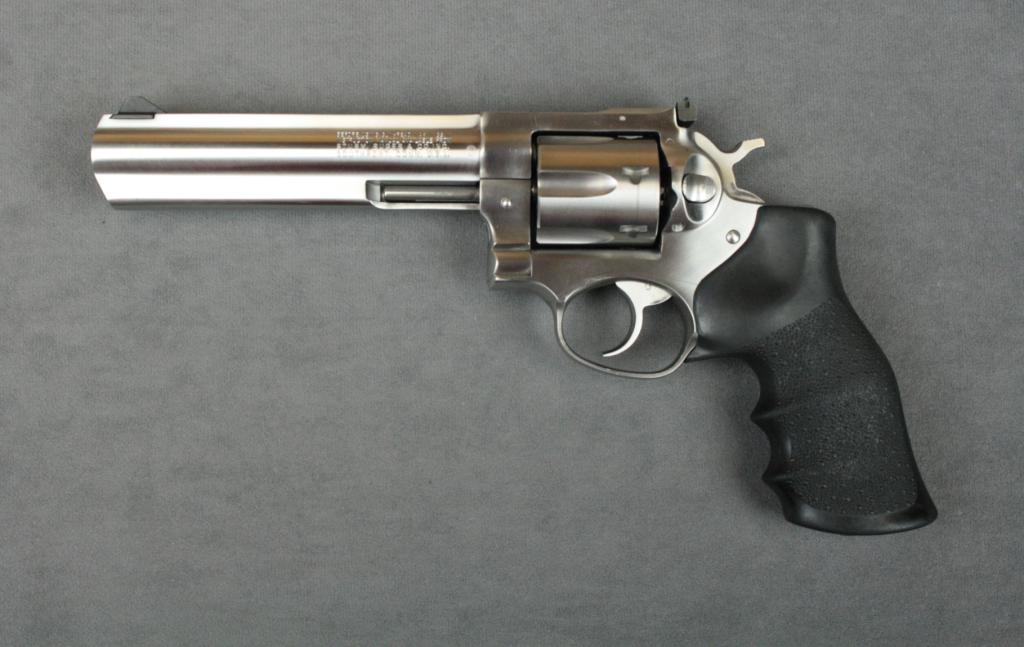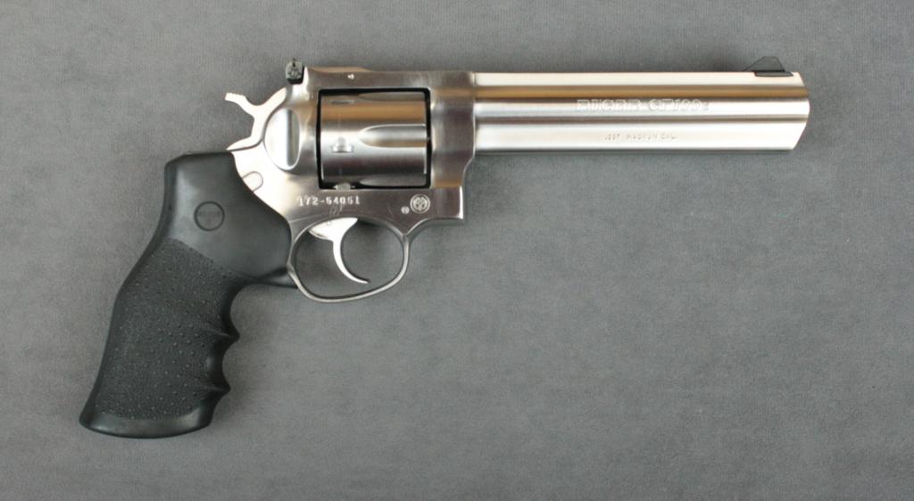 Ruger Model GP-100 DA revolver, .357 Magnum  cal., 6” barrel, stainless steel  construction, wrap around Hogue finger groove  combat grips, #172-54051. This gun is in  overall fine condition showing a crispaction, sharp markings, fine bore and grips.   Est.:  $350-$550.
