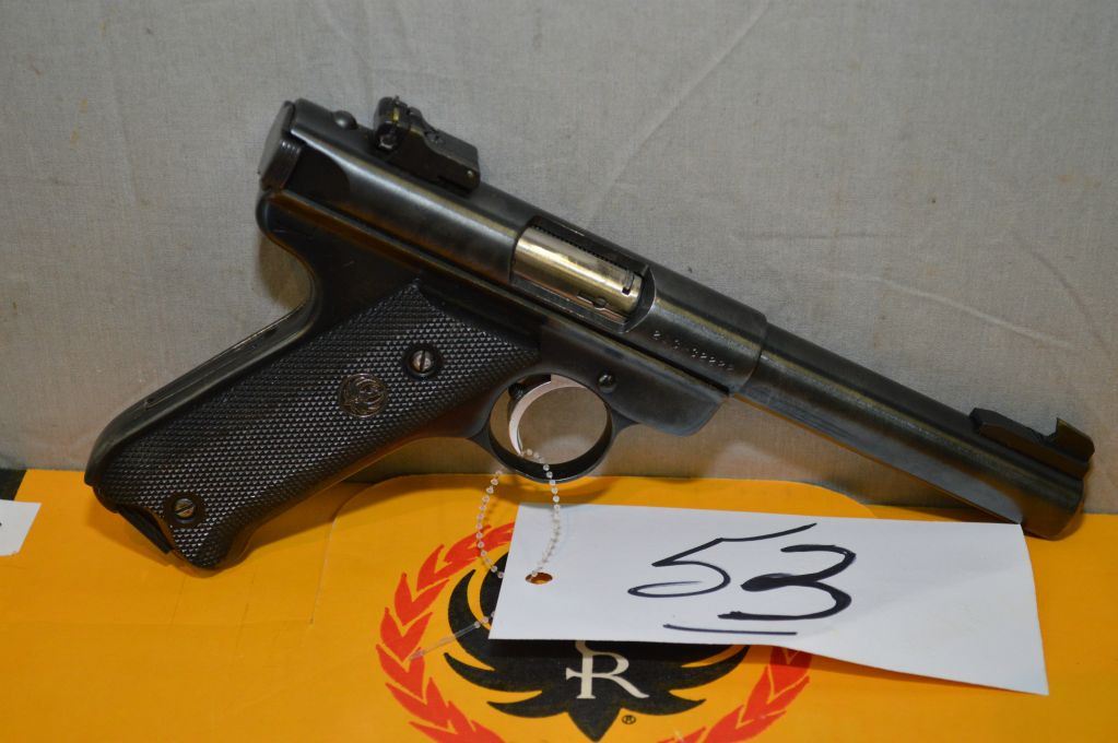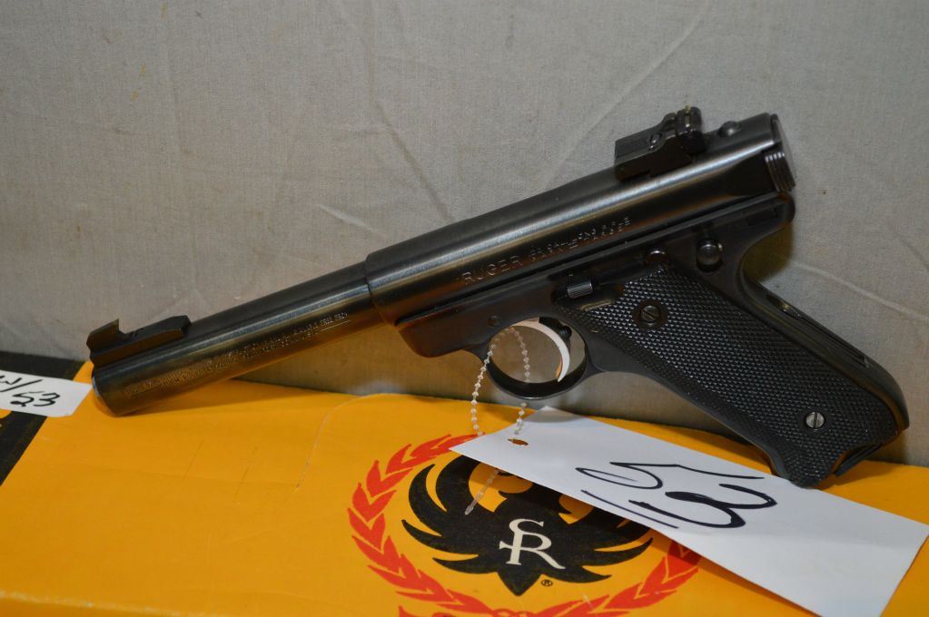 Ruger Model Mark II Target .22 LR Cal 10 Shot Semi Auto Pistol w/ 140 mm Bull bbl [ appears excellent, in original Ruger box w/ booklet & extra mag, blued finish, adjustable rear sight, black checkered Ruger grips ] Ser # 21332222 Restricted Handgun Cert # 18266137