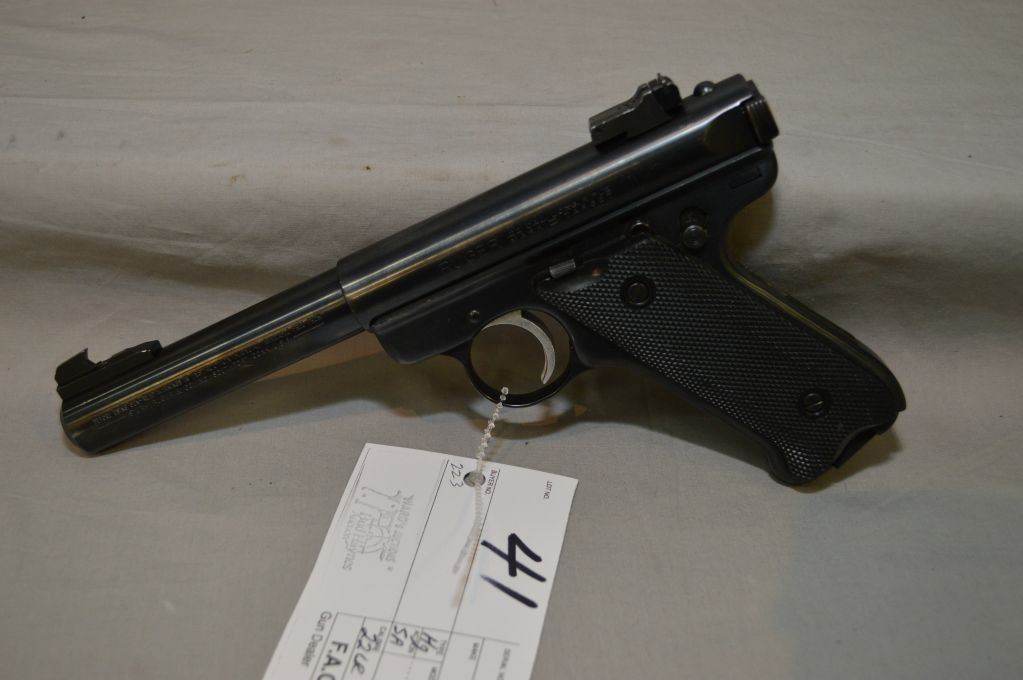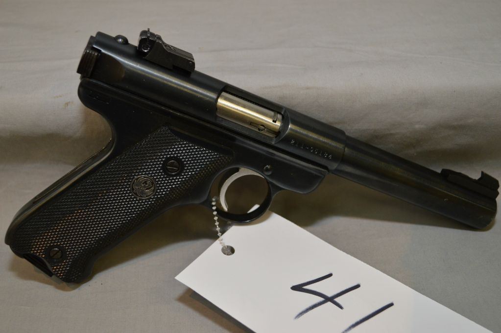Ruger Model Mark II Target .22 LR cal 10 shot Semi Auto Pistol w/ 140 mm bull bbl [ blued finish, adjustable rear sight, checkered black Ruger grips, few slight marks, & some wear to front & back strap ] Ser # 21105184 Restricted Handgun Cert # 17230478