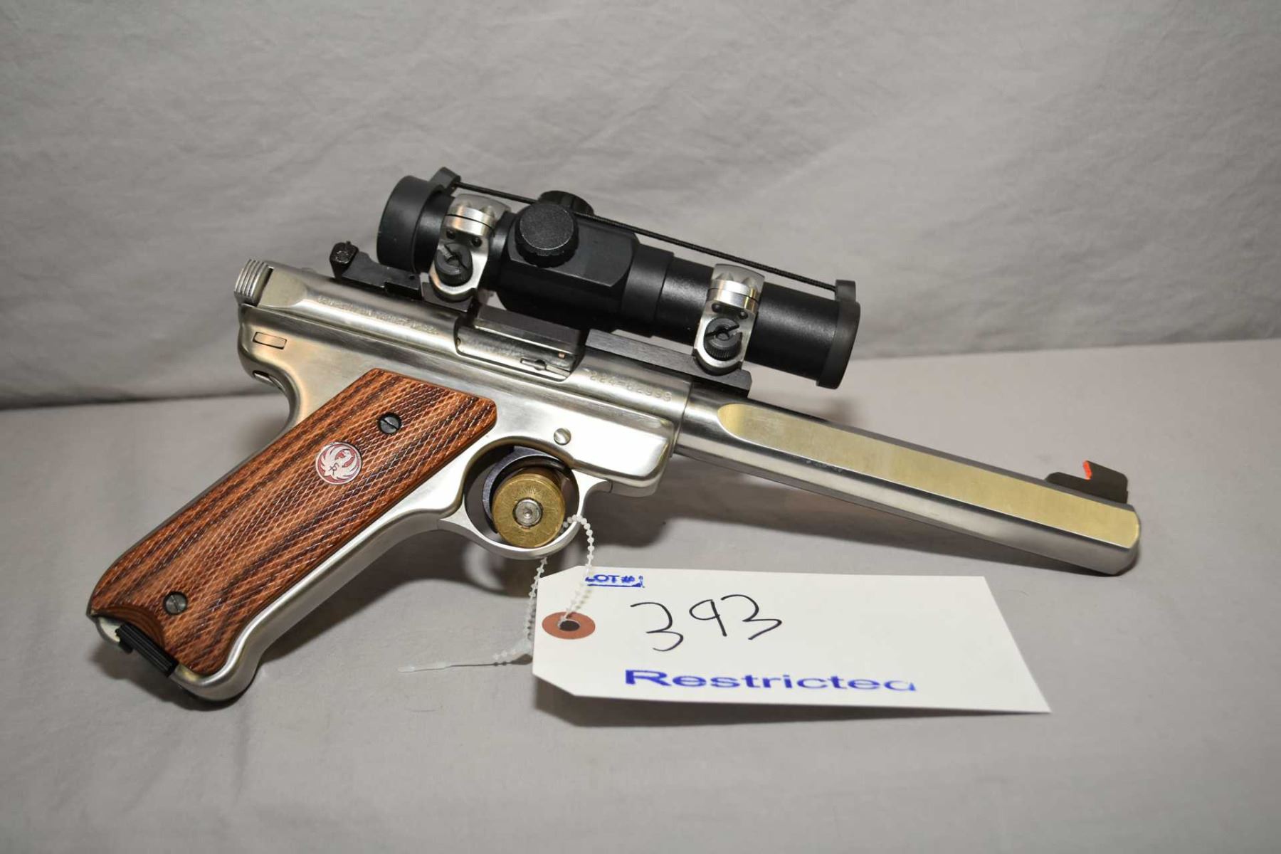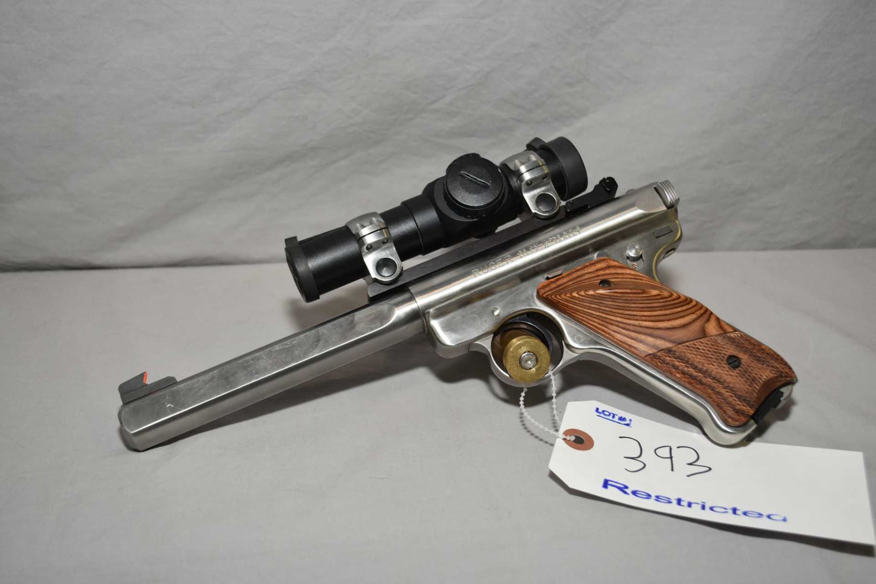 Ruger Model Mark II Target Competition Target Model .22 LR Cal 10 Shot Semi Auto Pistol w/ 175 mm bbl [ appears excellent, stainless finish, slab / side shaped barrel, blued sights, and base, stainless Ruger rings, with Bushnell Sportsman Aim Point electric sight, right hand checkered Ruger laminated style grips ] Ser # 22482999 Restricted Handgun Cert # 18769867 FRT # 22440 - 1