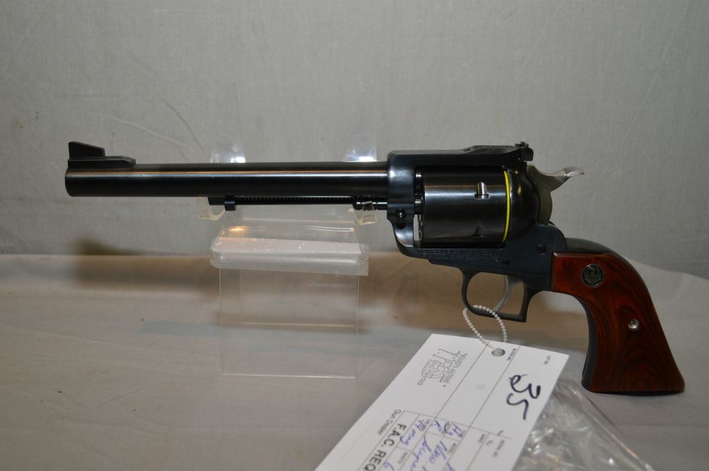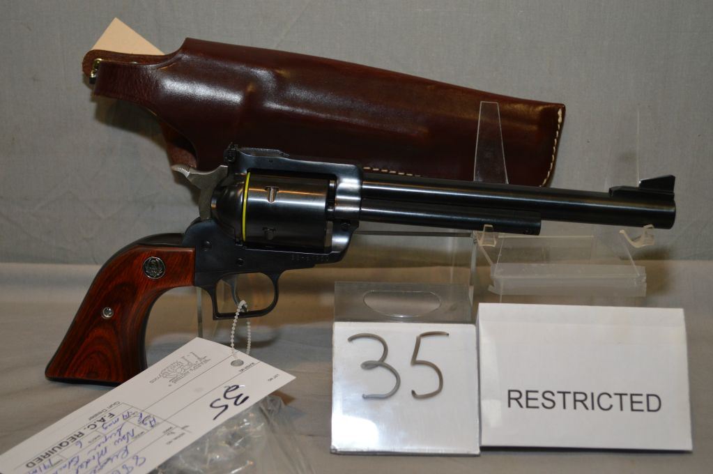 Ruger Model New Model Super Black Hawk .44 Magnum cal 6 shot Revolver w/ 191 mm bbl [ appears as new unfired w/ booklet, no box, but has Triple K new leather holster, blued finish, adjustable rear sight, rose wood Ruger insignia grips ] Ser # 8861950 Restricted Cert # 17803948
