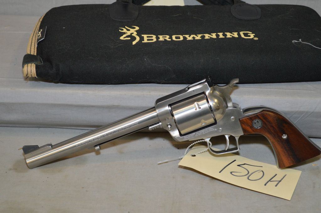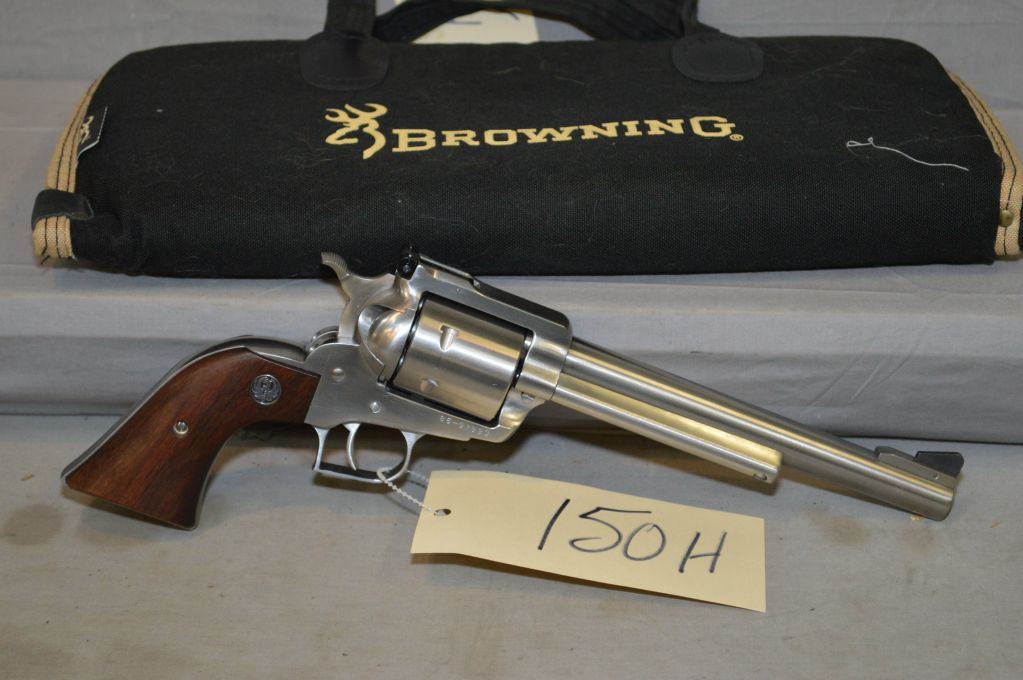 Ruger Model New Model Super Blackhawk .44 Mag Cal 6 Shot Revolver w/191 mm bbl [ appears excellent, stainless finish, adjustable rear sight, walnut Ruger insignia grips, slight cylinder ring, c/w Browning padded zippered soft case ] Ser # 8597993 Restricted Handgun Cert # 9739311