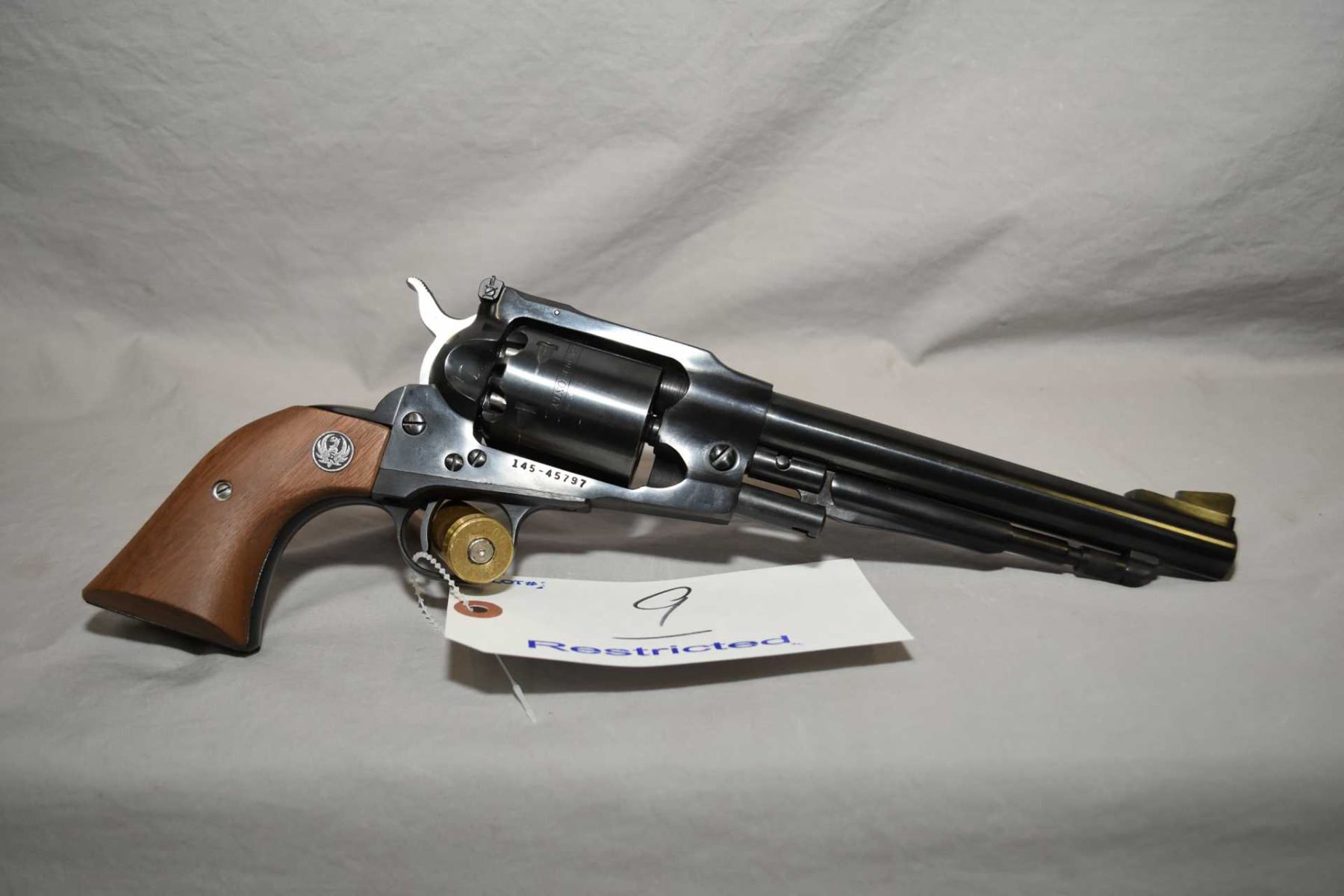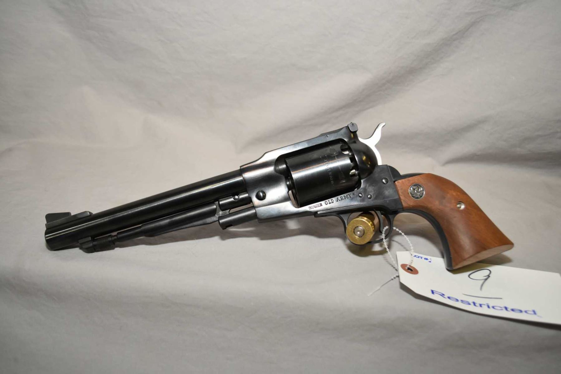 Ruger Model Old Army .44 Perc Cal ? 6 Shot Revolver w/ 191 mm bbl [ blued finish, adjustable rear sight, slight cylinder ring, few slight marks, mostly to hammer, walnut Ruger insignia grips, appears v - good , caliber maybe .45 Perc, but believed to be .44 Per Cal ] Ser # 14545797 Restricted Cert # 5782967 FRT # 24910 - 1