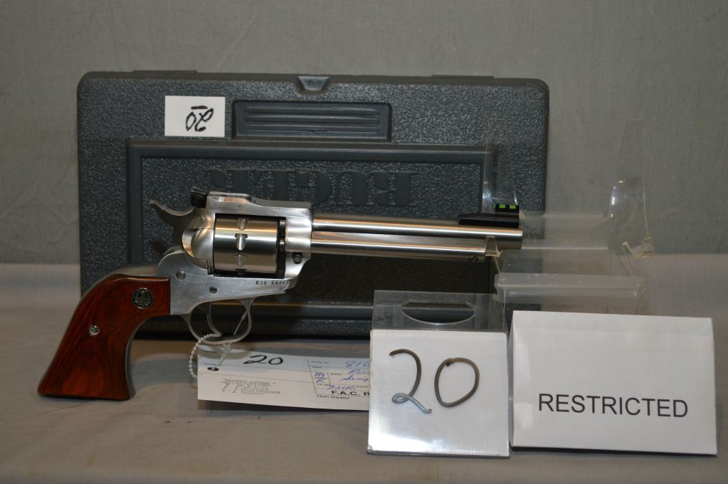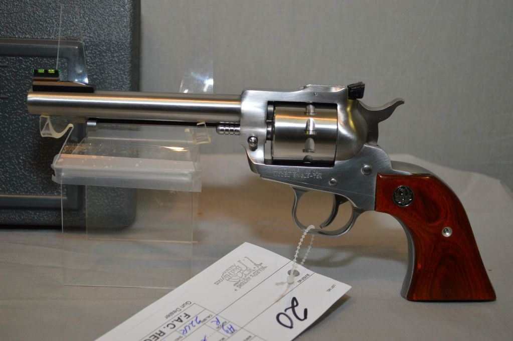 Ruger Model Single - Ten .22 LR cal 10 Shot Single Action Revolver w/ 140 mm bbl [ appears as new, unfired in orig plastic case, booklet, lock, etc, stainless steel finish, blued glo thru sights, rear adjustable, rosewood Ruger insignia grips ] Ser # 81006776 Restricted Handgun Cert # 18263319