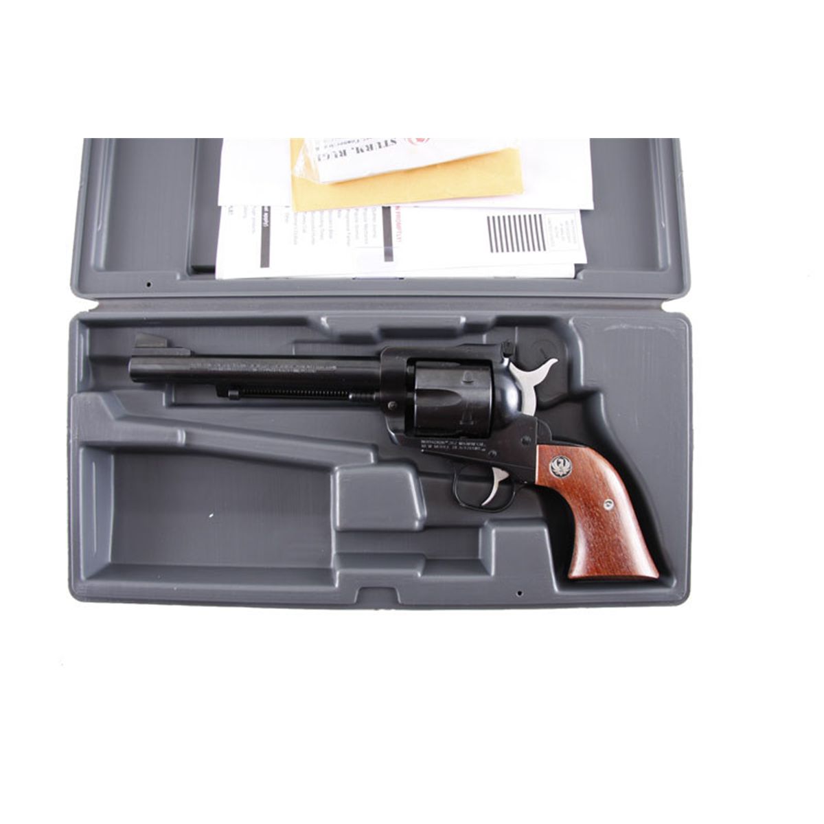 Ruger NM Blackhawk Cal .357mag SN:37-85599 Single action 6 shot revolver in .357 Magnum. Blued finish, smooth wood grips with medallions, 6 1/2" barrel with adjustable sights, good bore and action. Included in grey plastic carry case with instructions,Single action 6 shot revolver in .357 Magnum. Blued finish, smooth wood grips with medallions, 6 1/2" barrel with adjustable sights, good bore and action. Included in grey plastic carry case with instructions,and gun lock. Condition: Near new with no sign of use.