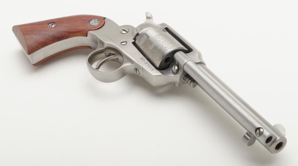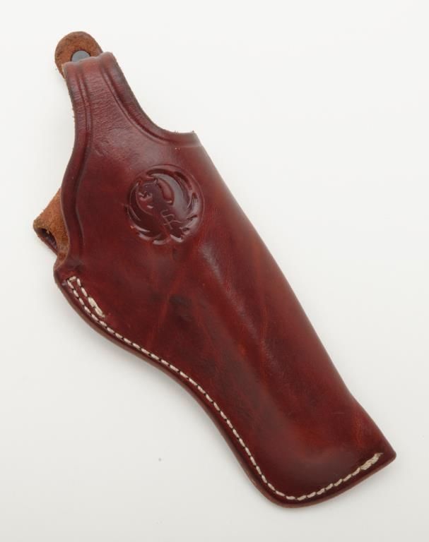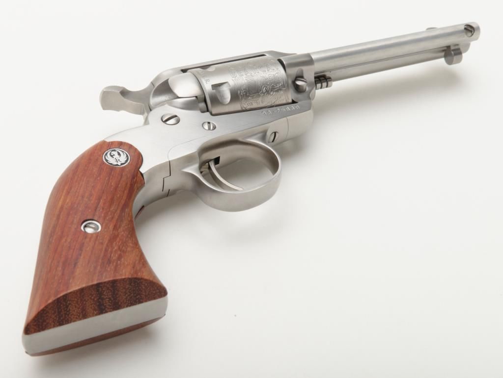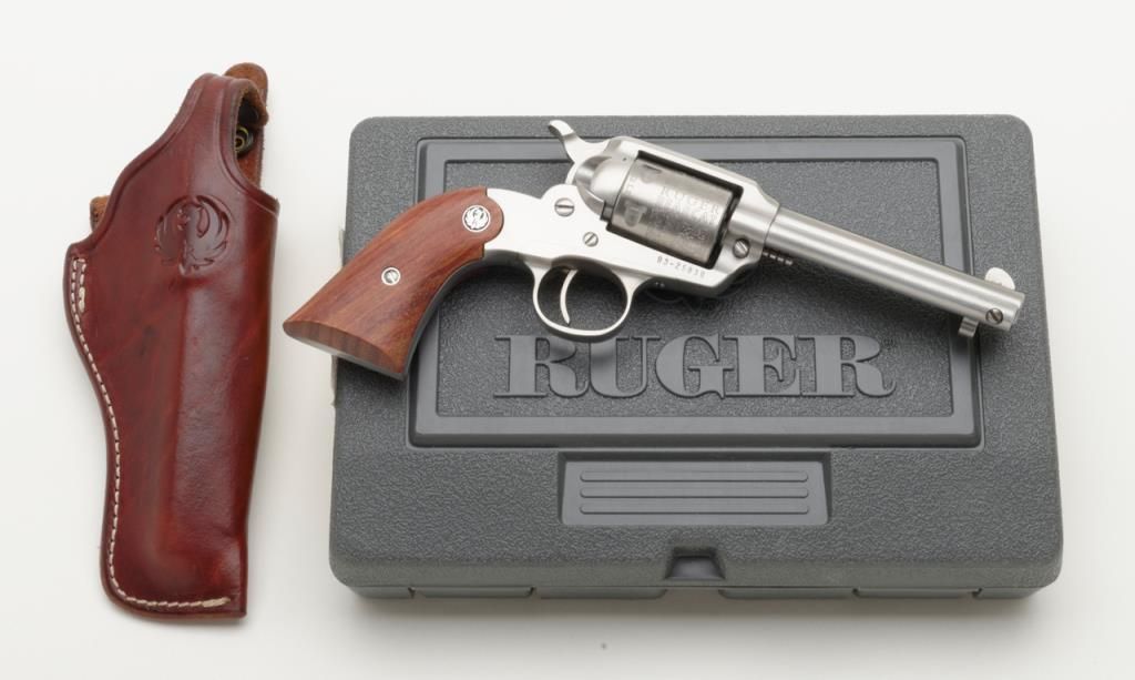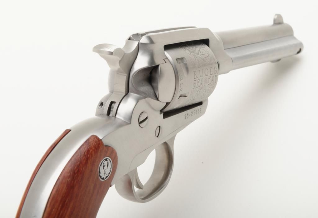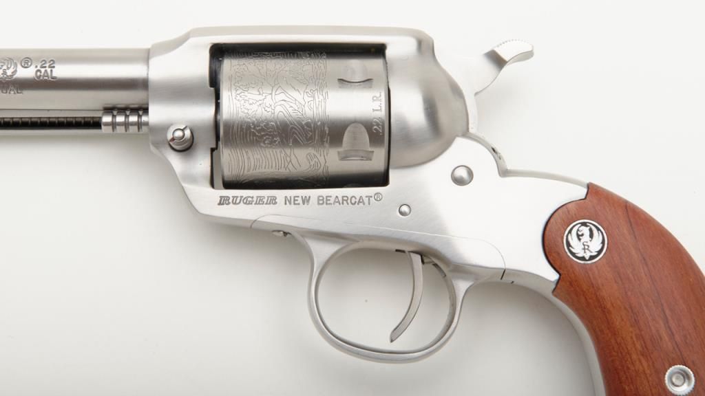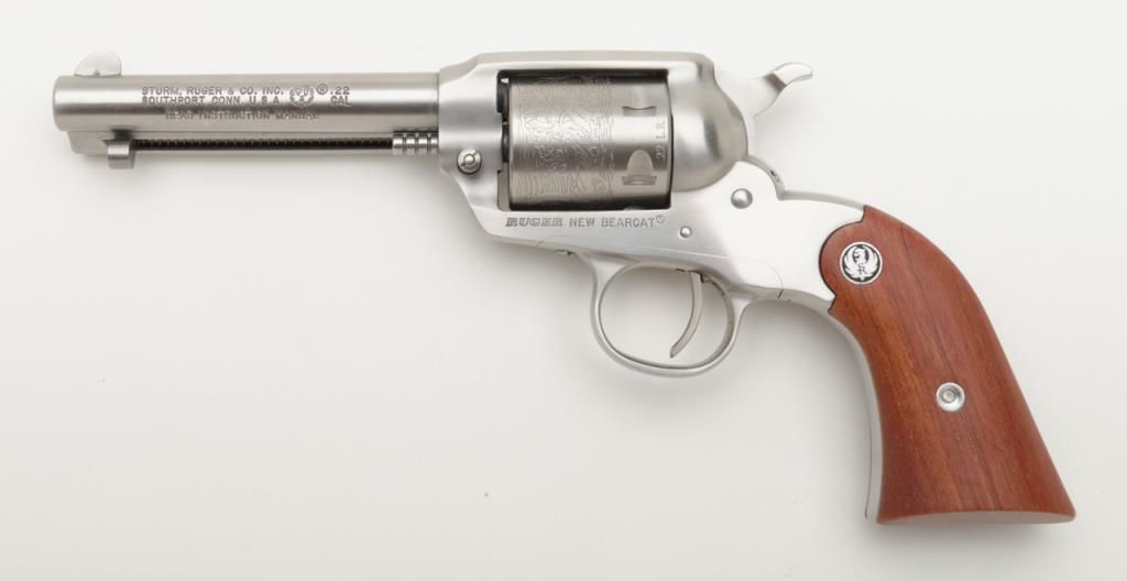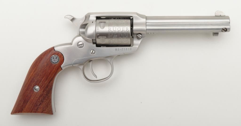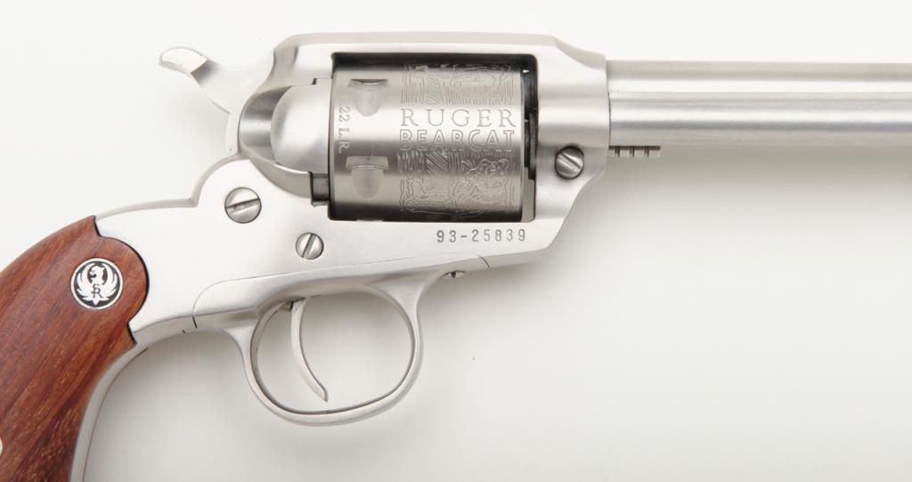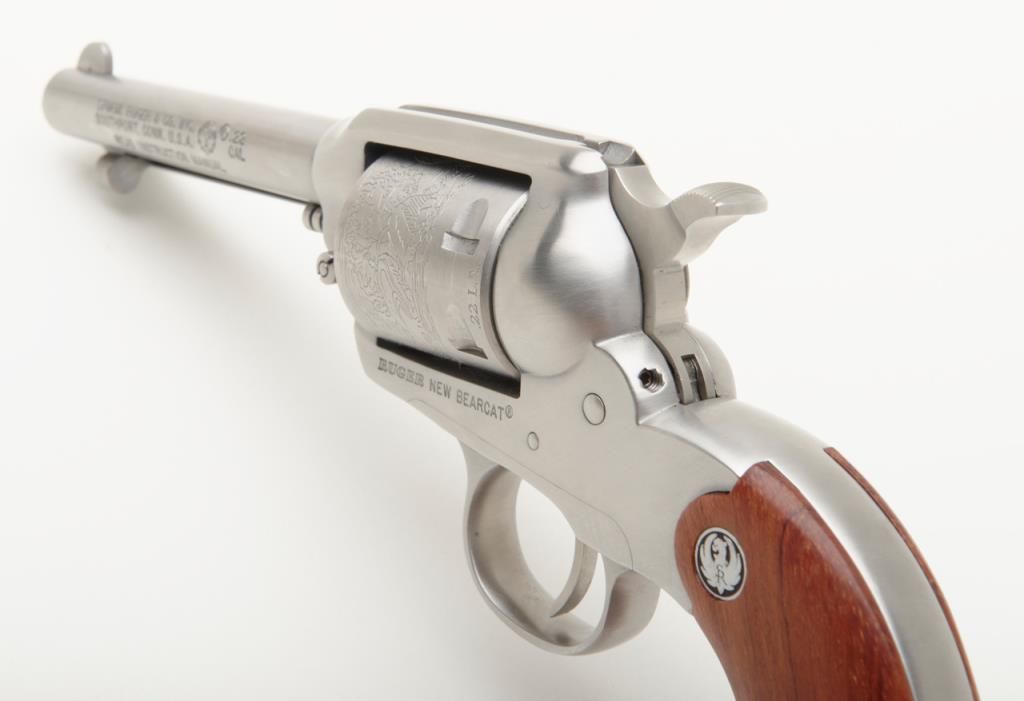 Ruger New Bearcat, .22 LR caliber stainless steel single action revolver with 4 ¼” barrel and plain medallion grips with roll die engraved cylinder, serial number 93-25839. A Ruger marked holster for this pistol is included. The condition is will fine to near excellent showing some minor firing and slight use Est.: $200-$400