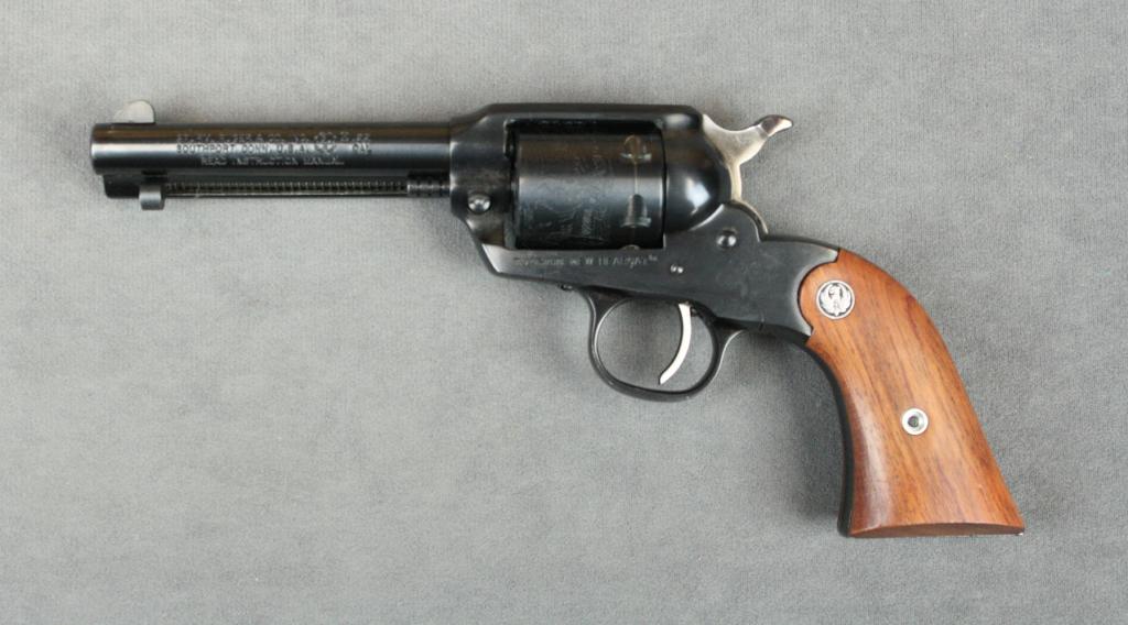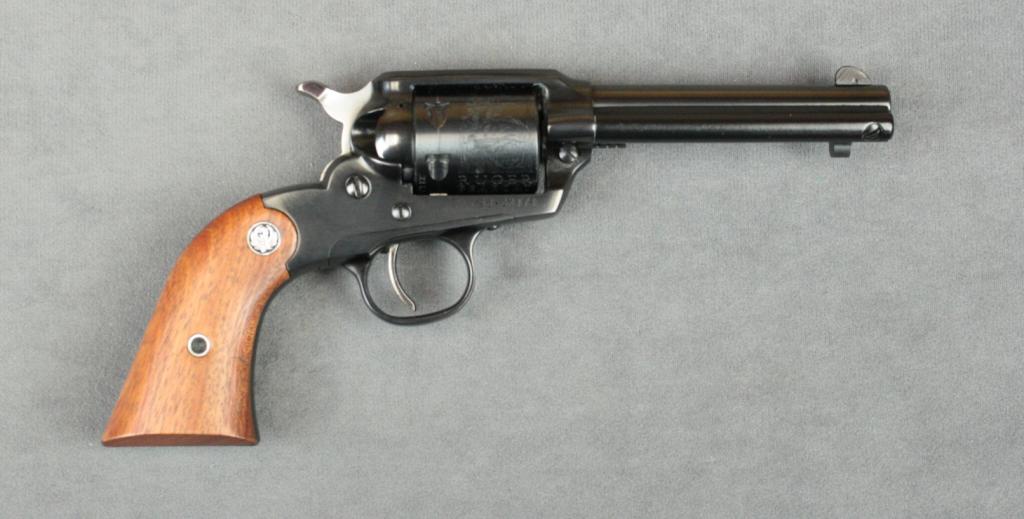 Ruger New Bearcat single action revolver, .22  cal., 4” barrel, blue finish, smooth wood  medallion grips, #93-22171 in factory grey  hardcase with end label numbered to this gun  and instructions and a safety lock. This gunis in overall like new condition showing  approx. 99%+ original finish, fine bore,  action, markings and grips.  Est.:   $250-$500.