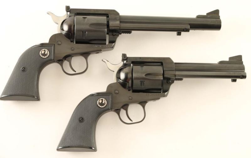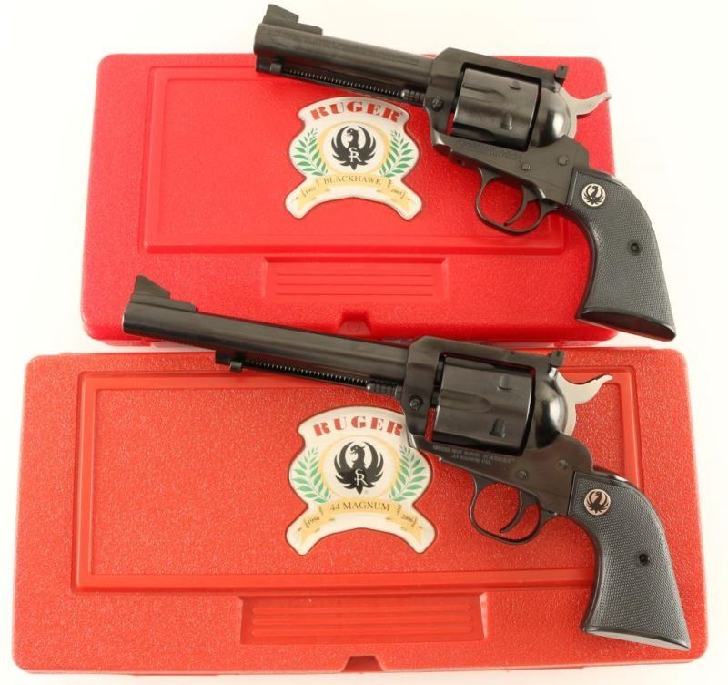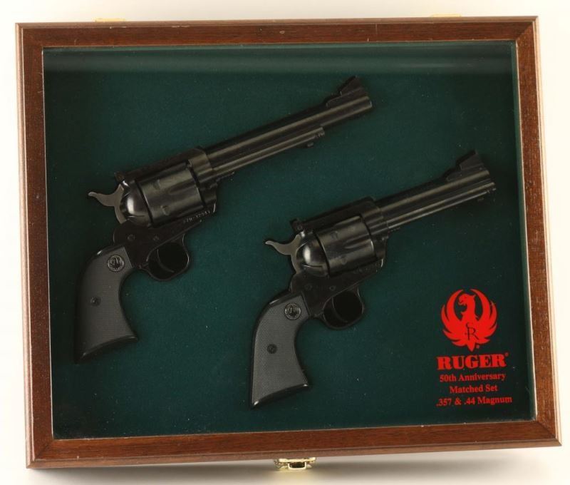 SN: 520-12341. 870-12341 '50th Anniversary Matched Set' Sequentially numbered pair of single action revolvers chambered in .357 & .44 Magnum, circa 2006. Features: blued finishes, 4.625" & 6 1/2" barrels with gold color-filled 50th anniversary markings, raised ramp front sights, Micro adjustable rear window sights, flat-top frames, ejector rods, fluted six-shot cylinders, transfer bar safeties, serrated hammer spurs, smooth triggers, and two-piece checkered black plastic grips with Ruger medallions. Includes an etched glass-top wood presentation case and the original factory hard cases with documents, spent cases & locks. Revolvers exhibits approximately 99% of their original blued finishes showing minimal handling marks/scratches and faint drag lines on their cylinders. Actions are smooth with tight lock-up, bores are excellent and plastic grips are fine. Condition is near NRA new in cases. ***Modern Firearm***