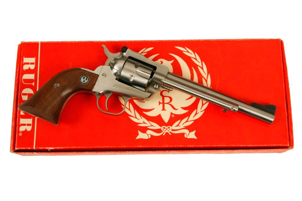 Ruger New Mdl Single 6 Cal .22LR/Mag SN:64-67560, Single action convertible .22 LR/.22 Mag revolver. Stainless steels construction, wood grips with black medallions, 6 1/2" barrel, adjustable sight, good bore and action. Condition: Very good to excellent in original box numbered to the gun. Both cylinders and paperwork included.