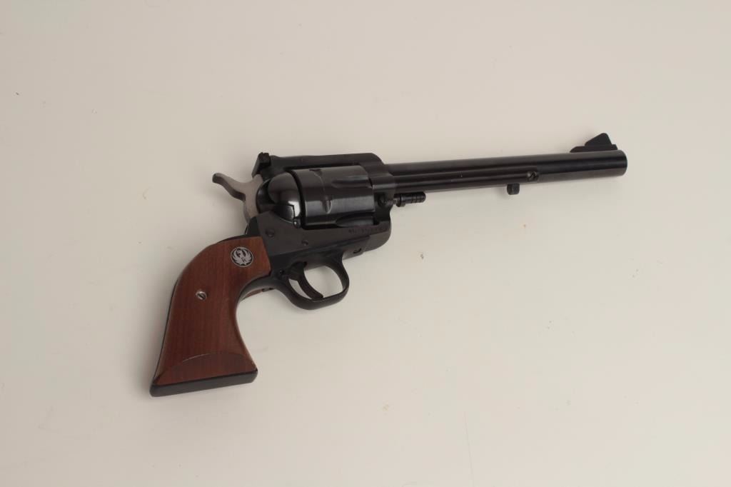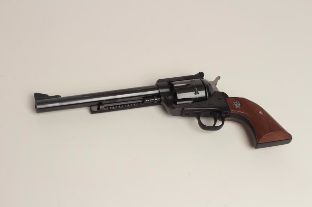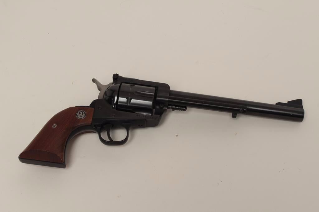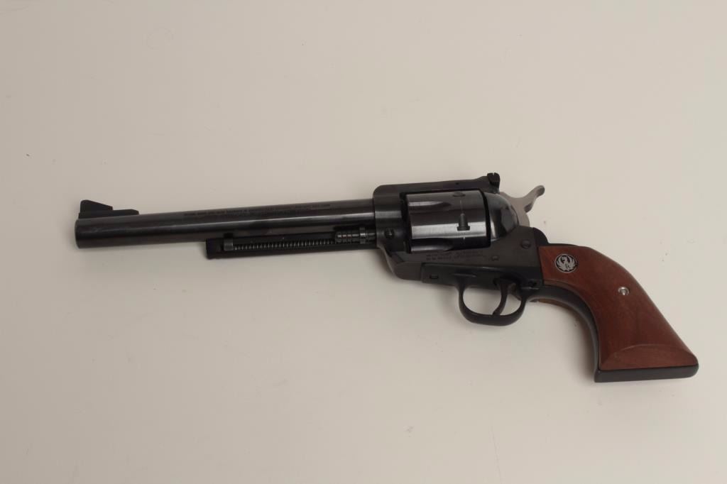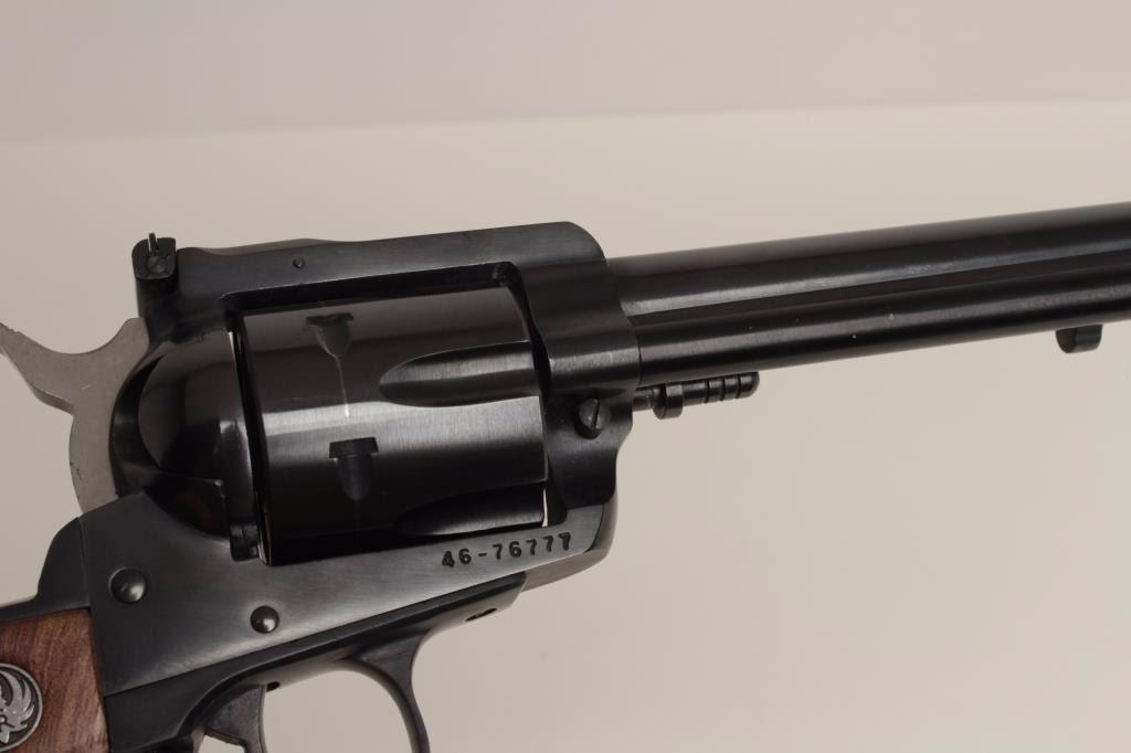 Ruger New Model Black Hawk revolver, .45 caliber, serial #46-76777. The pistol is in very good to nearly new condition with a 7 ½” barrel with a ramp front and adjustable rear sights. The pistol retains nearly all ofits original blued finish with only handling marks and a light drag line on the cylinder noted. The smooth wood medallion grips are in very good condition showing only storage marks. The bore is very good, the action iscrisp and the markings are sharp on this lightly used Ruger. (Modern) Est.: $350-700.