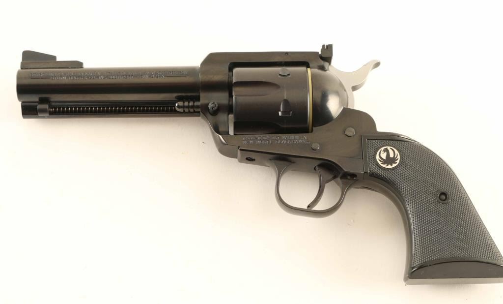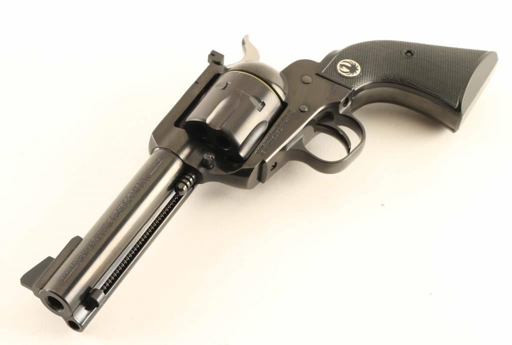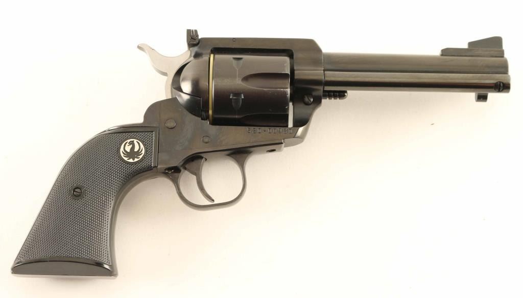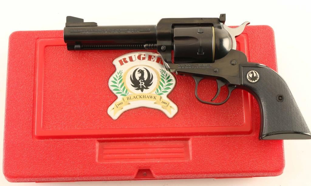Revolver, 6-Shot. Large frame, single-Action. Large frame, single-action, Manufactured 2005. 50th Anniversary Model. Top of barrel marked in gold Tone, "50th Year Blackhawk. 1955-2005". Blued finish, chrome trigger. Black, plastic, pebbled grips. 4' round barrel. ramped front sight, micro, adjustable rear sights. Bore, and cylinder chambers are excellent/bright. Action is crisp/tight. Smooth trigger. transfer bar. Blued finish is about 99%, with some slight drag lines on the cylinder. Comes in the original Ruger 50th Anniversary red plastic box , with safety lock, security system keys, and manual. revolver is in almost new condition. NRA Condition-Excellent. Modern Firearm.
