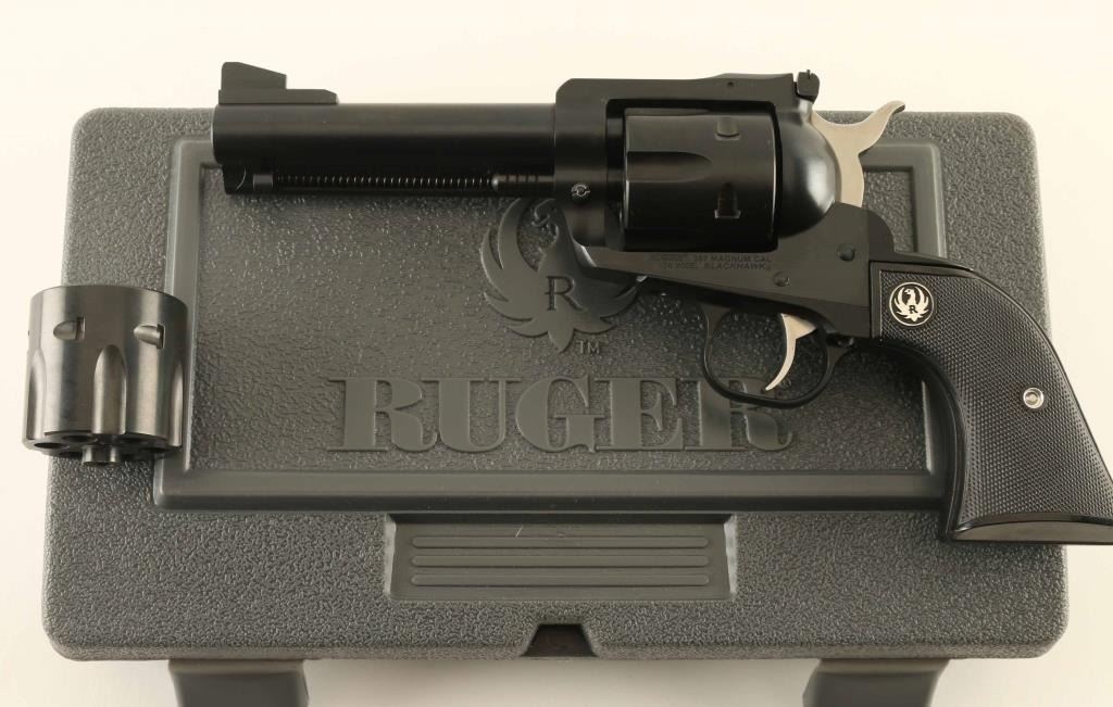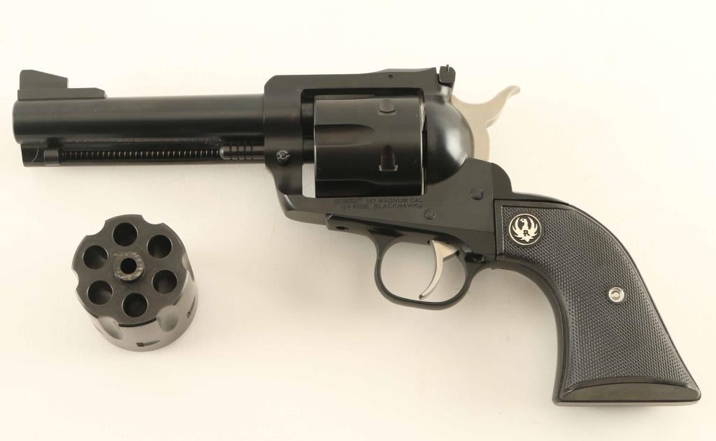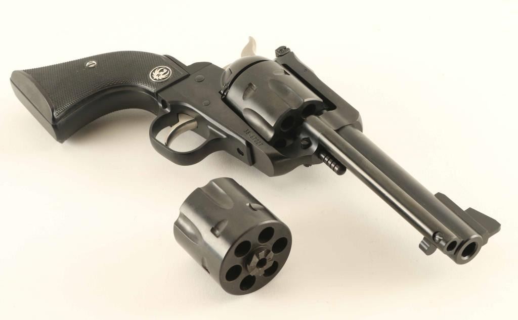 SN: 38-67027 Single action revolver with two cylinders, 9x19mm and 357 Magnum. Features blued finish, checkered black plastic grips with Ruger medallions, bright stainless hammer and trigger, approx 4.5" barrel, adjustable sights. Cylinders are marked "027" on front. Frame is marked "357 Magnum". Bore is excellent condition. Overall condition is 99% with visible drag line on installed cylinder (appears to be 9mm), tiny amount of bare metal visible at cylinder pin latch. Spare cylinder (appears to be 357) is like new. Action is smooth, locks up tights, has crisp let-off. Includes manual and gray plastic Ruger storage case. Condition is Excellent ***Modern Firearm***