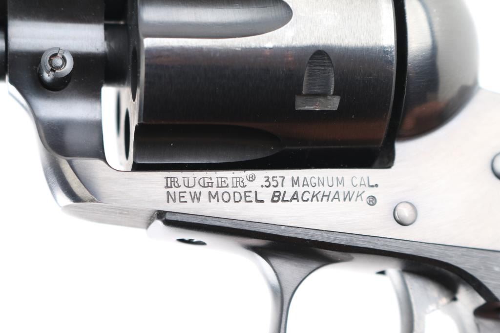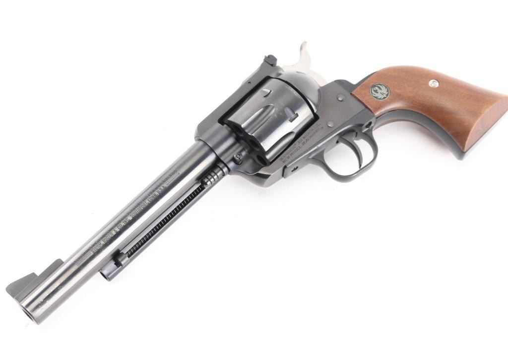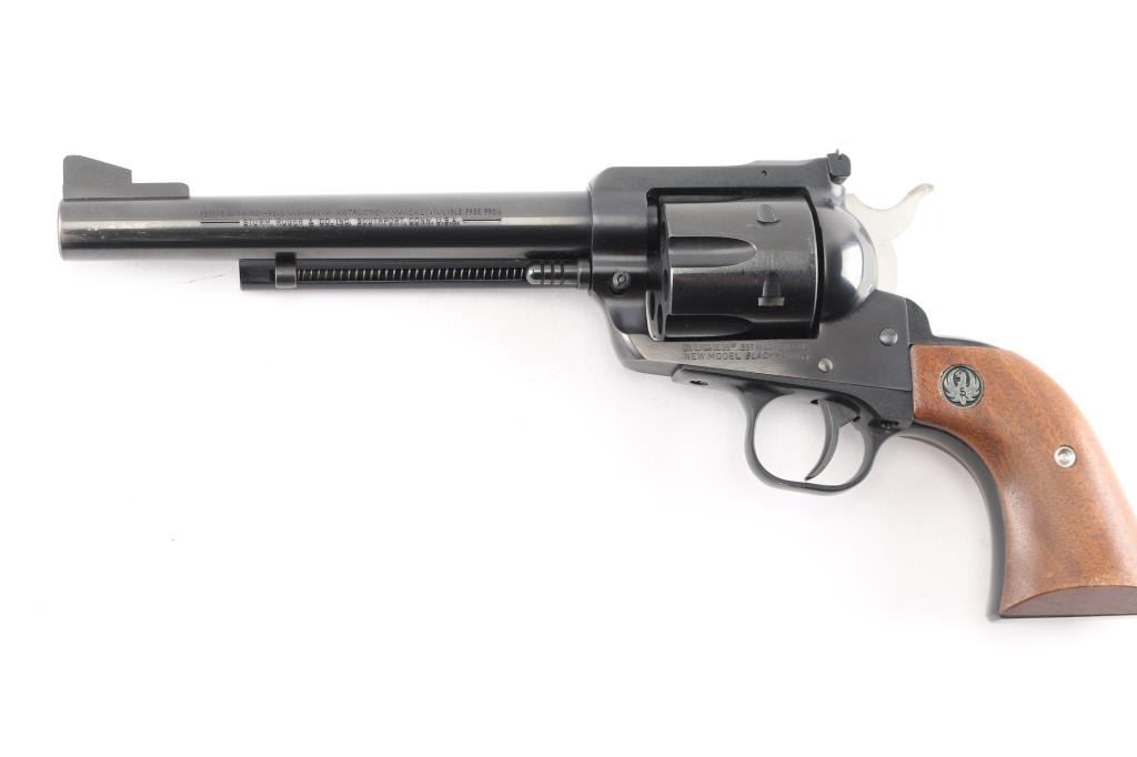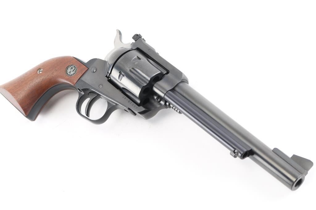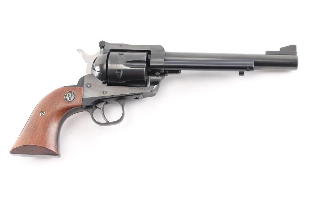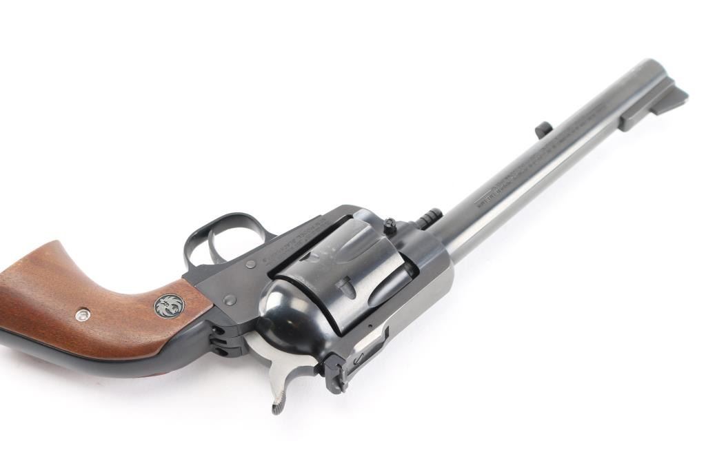 Sn: 34-07907. New Model, American made single action revolver chambered in .357 Mag. Features a blued finish, 6 1/2" barrel, raised serrated ramp front sight, Micro adjustable rear sight, serrated hammer spur, fluted six-shot cylinder, flat top frame, black finished aluminum alloy grip frame and two-piece smooth walnut grips with Ruger medallions. Revolver retains most of it's original blued finish is about 98% with slight muzzle wear, tracking on cylinder. Good lock-up, the bore appears excellent and the wood grips are very good with a very minor chip on the bottom of the right panel.
