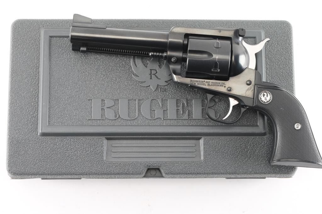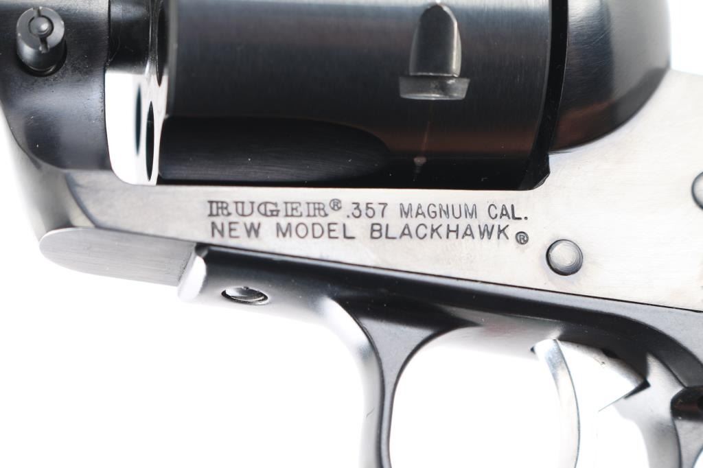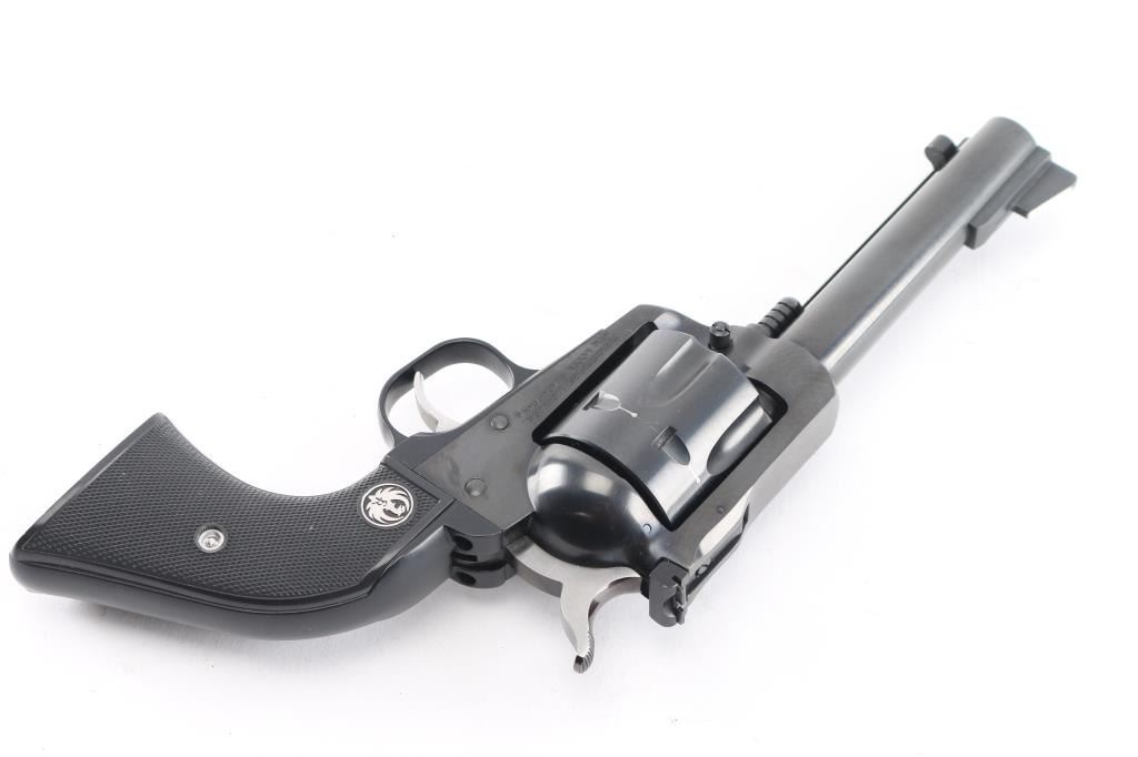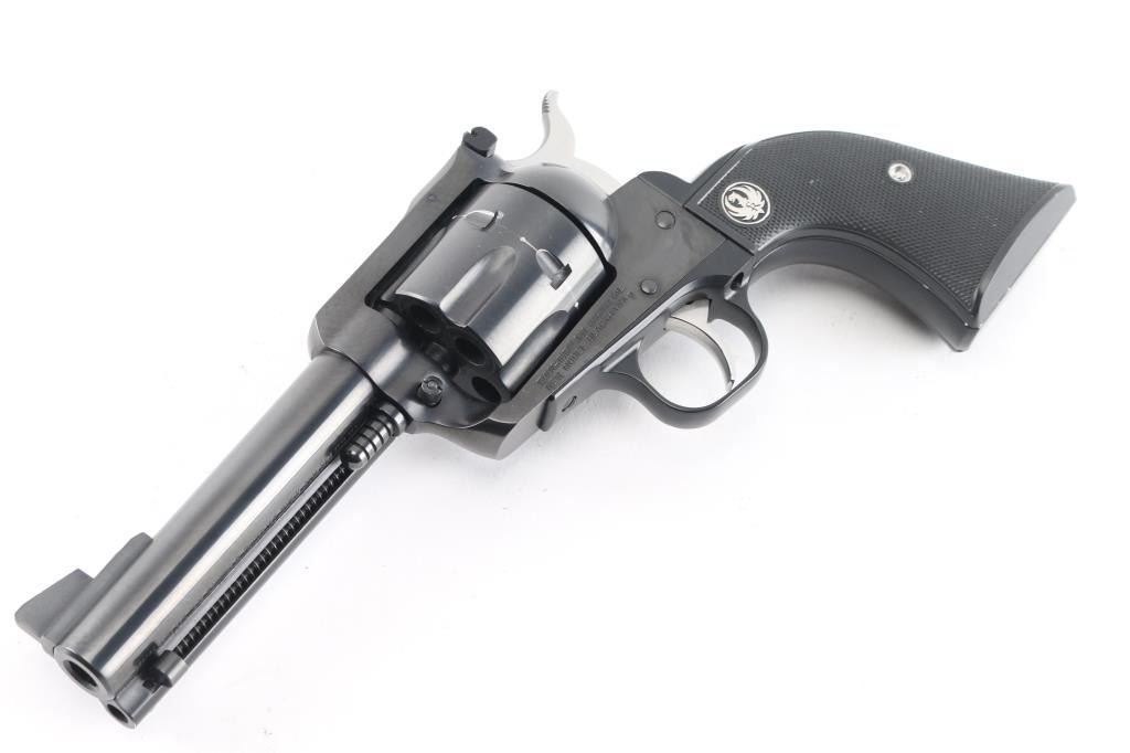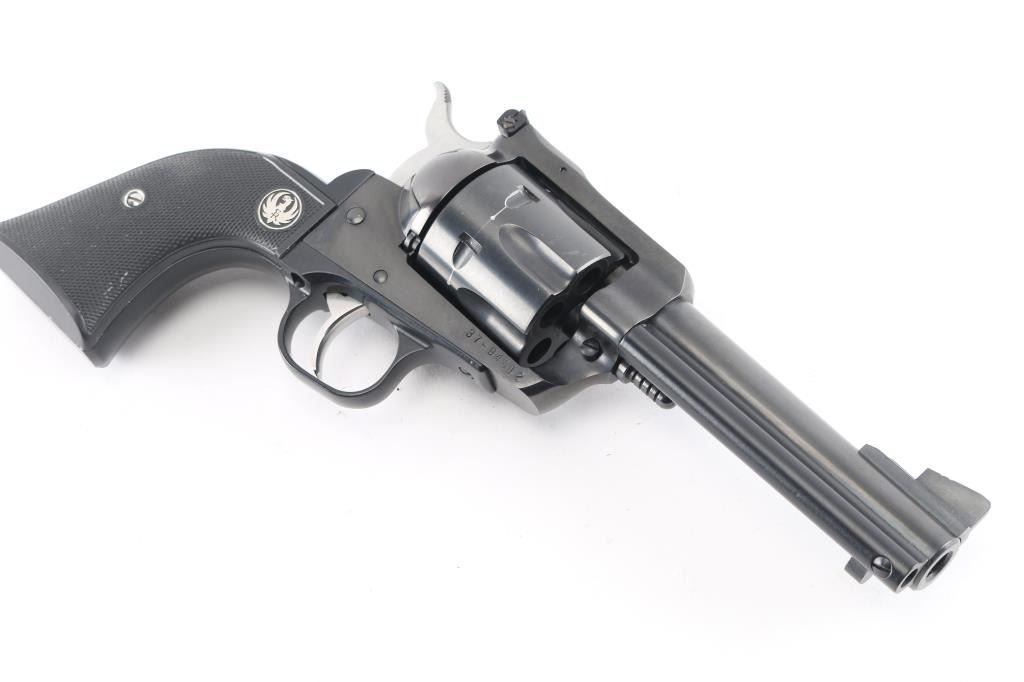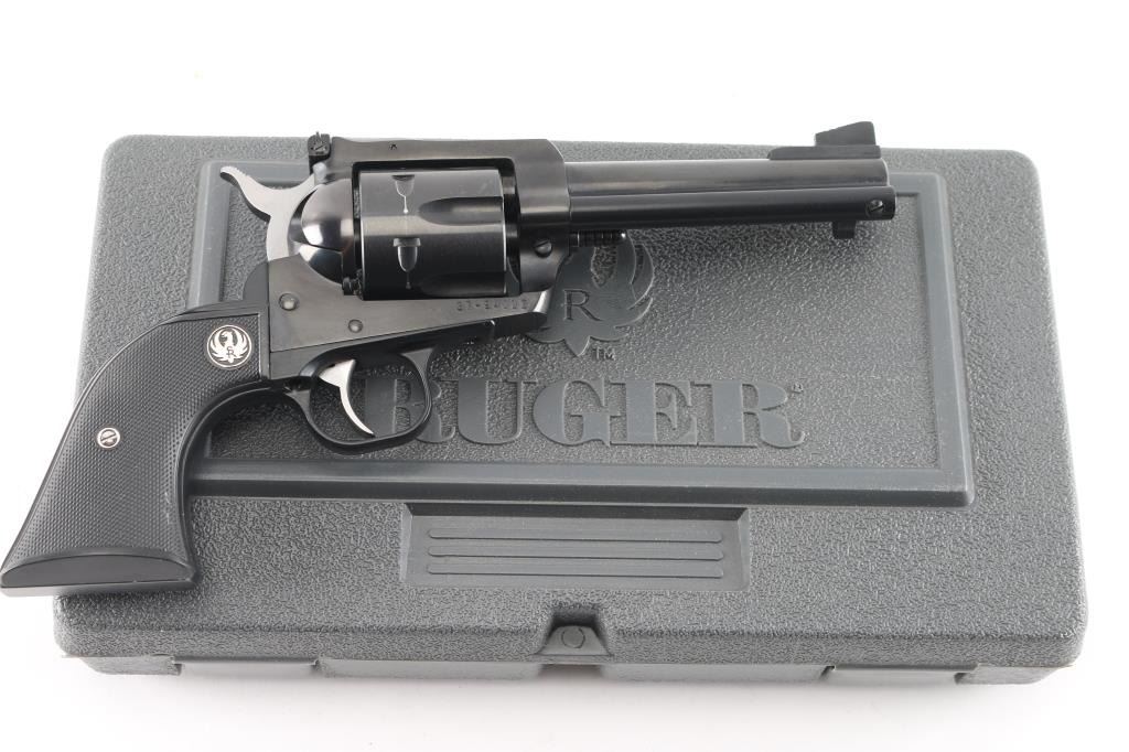 Sn:37-94012. New Model, American made six shot single action revolver chambered in .357 Mag. Features a blued finish, 4.62" barrel, raised serrated ramp front sight with white accent paint, Micro adjustable rear sight, smooth curved trigger, serrated hammer spur, fluted six-shot cylinder, black finished aluminum alloy grip frame with black plastic checkered grips with Ruger medallions. Revolver retains approx. 98% finish with drag line on cylinder. Bore is bright with strong rifling. Action is smooth with tight lockup. Grips are excellent. Includes original factory gray plastic case, manual and lock. Condition is NRA Excellent. ***Modern Firearm***