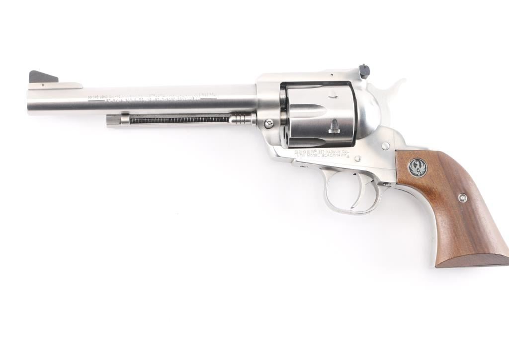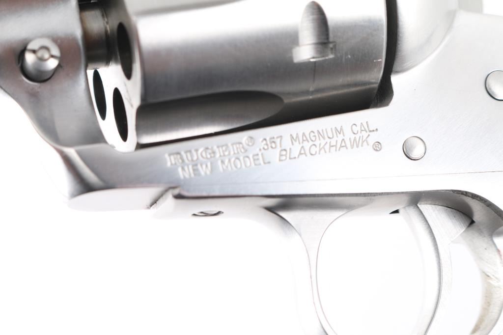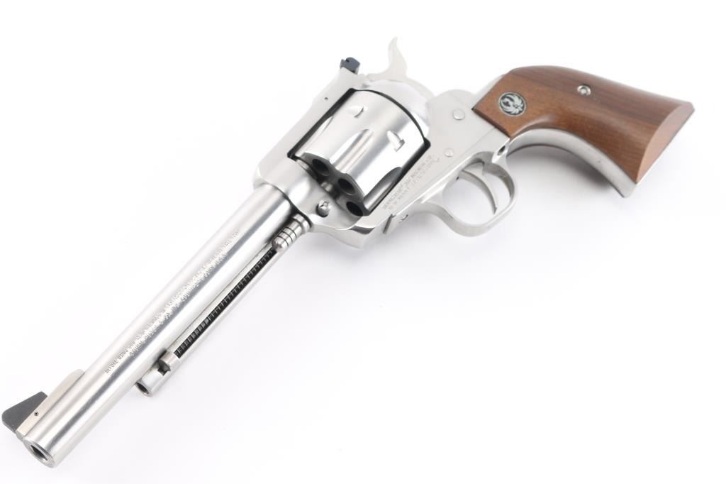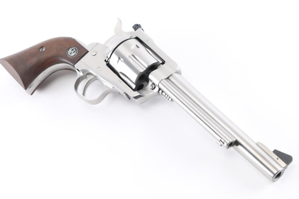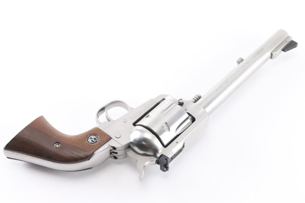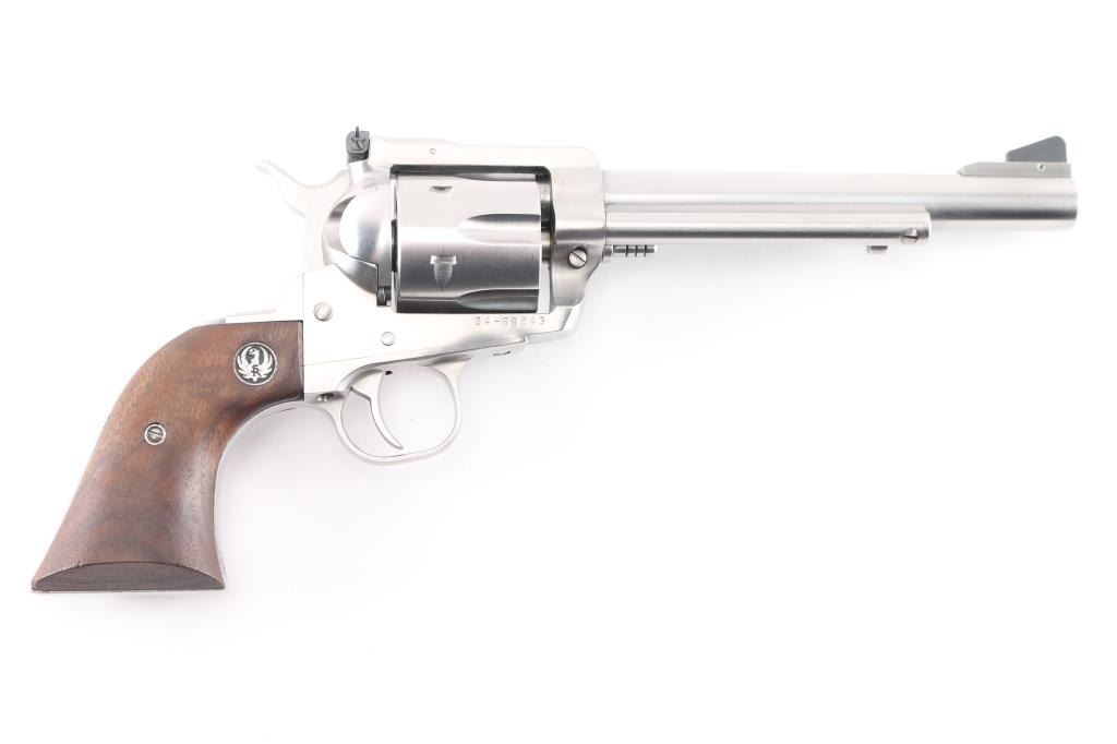 Sn: 34-59243. American made stainless steel single action revolver chambered for .357 Magnum cartridges, circa 1979. It features a brushed finish, 6.5" barrel, raised serrated ramp front sight, fully adjustable rear sight, smooth trigger, serrated hammer spur, transfer bar safety, fluted six-shot cylinder, captured ejector rod, and two-piece smooth walnut grips with silver/black Ruger medallions. Metal finish looks very good but does show some minor scratches and there is a slight drag line on the cylinder. Wood grips look very good. Bore is excellent/bright. Action is smooth.Condition is NRA Very Good+. Modern Firearm.