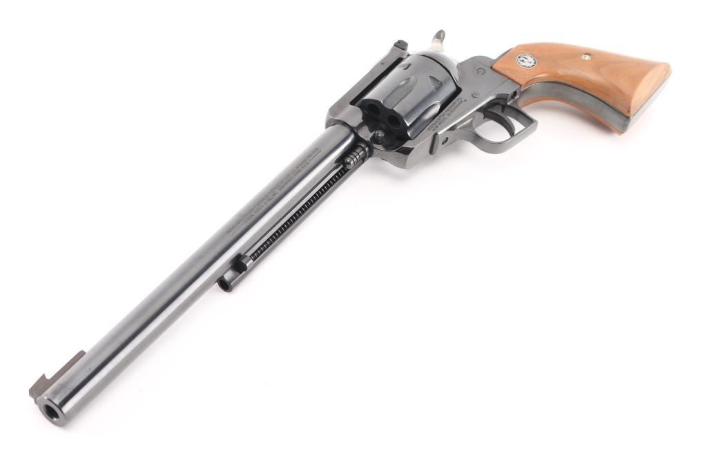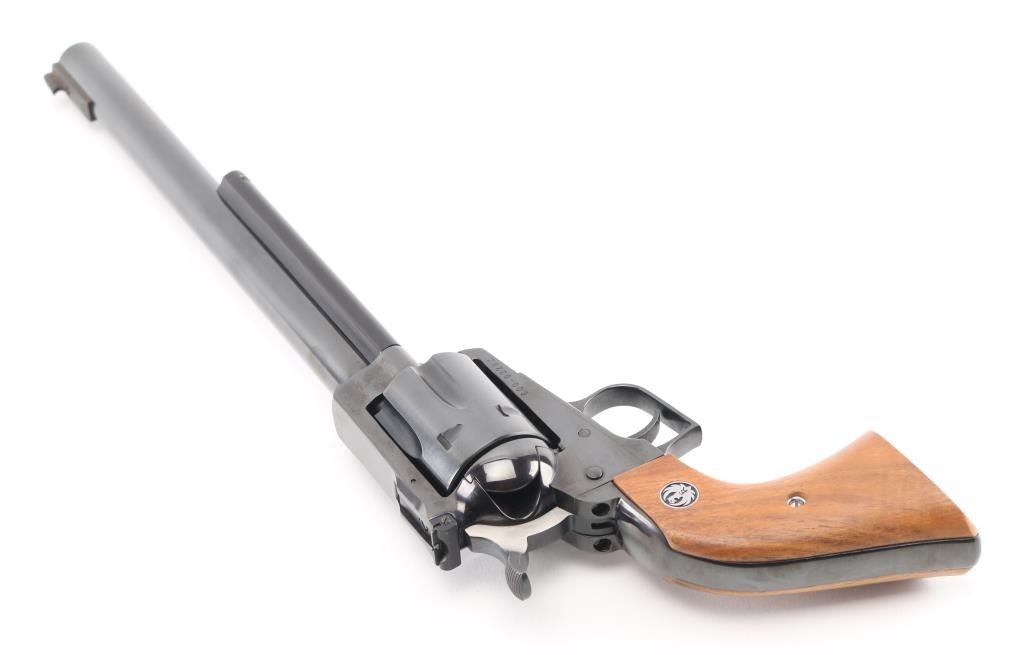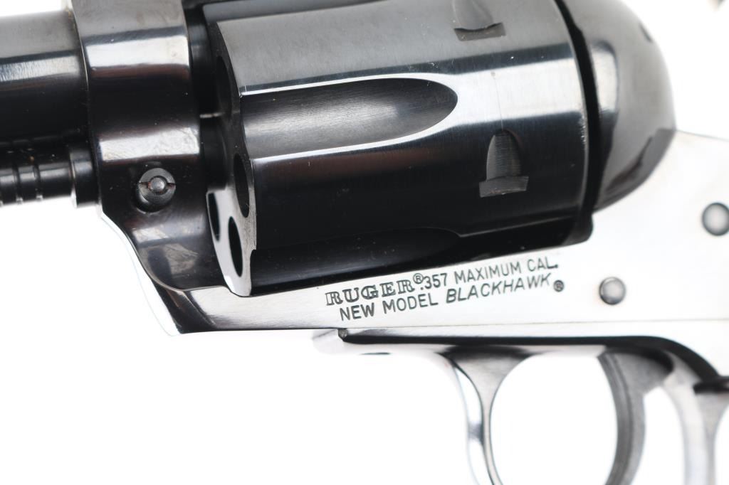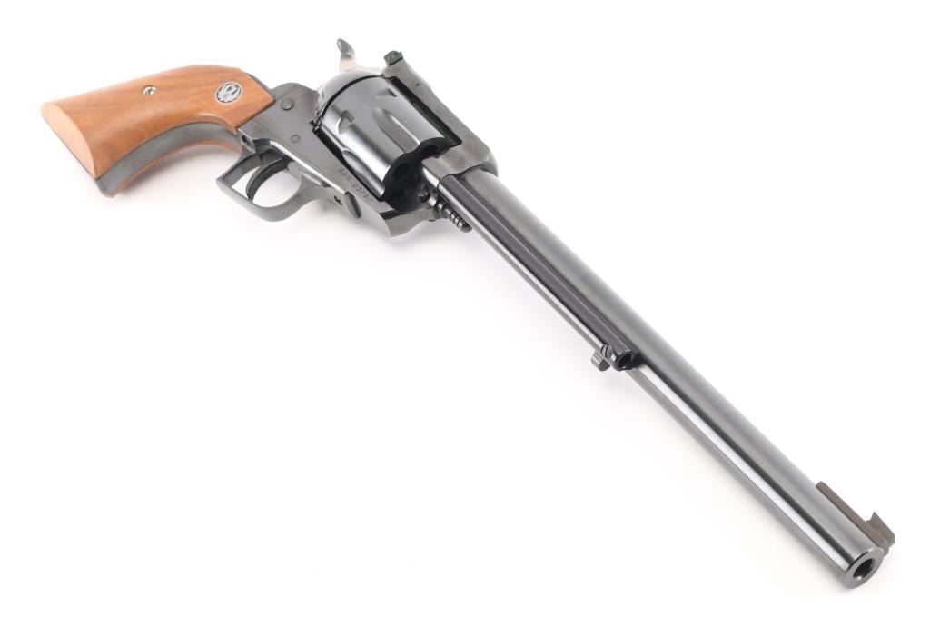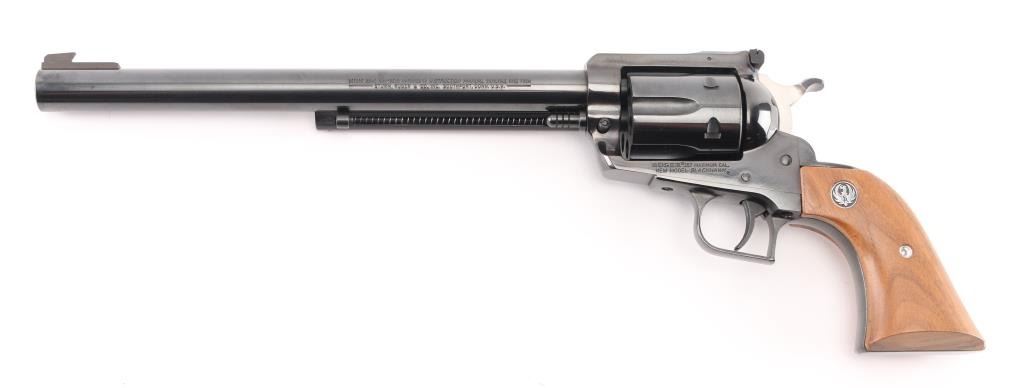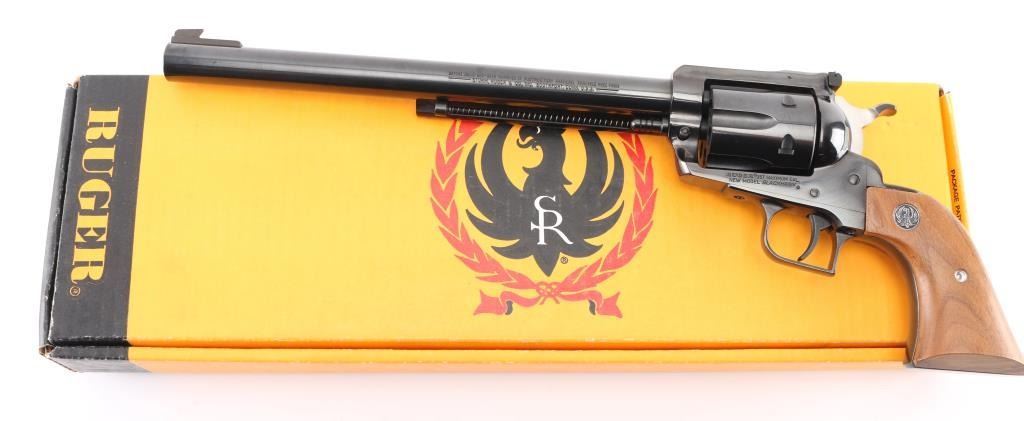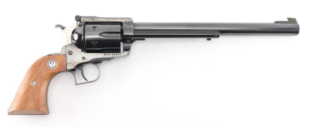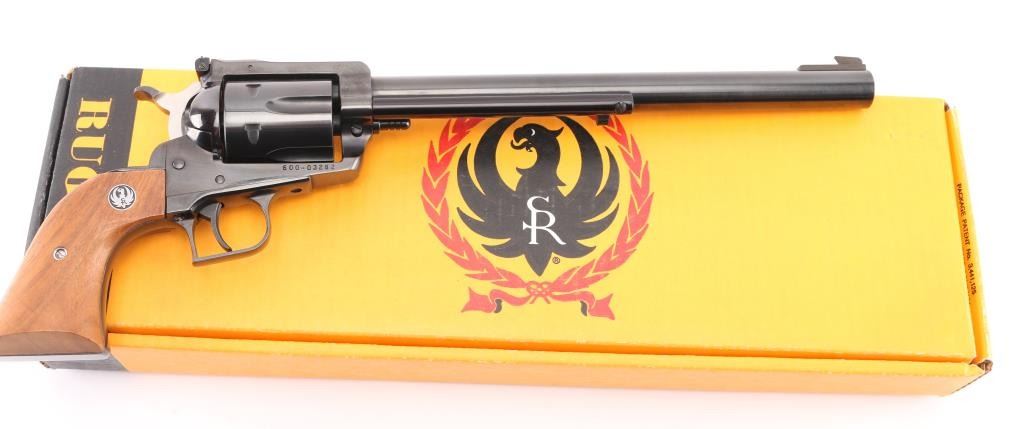 SN:600-03282 Scarce American made six shot revolver chambered for .357 Maximum ammunition. It has a 10.5" barrel, raised blade front sight, adjustable rear sight, fluted cylinder, smooth trigger, serrated hammer spur and smooth wood grips with Ruger medallions. Comes with Ruger box and owners manual. 99% original finish excellent bore and grips. Condition is NRA Excellent *Modern Firearm*