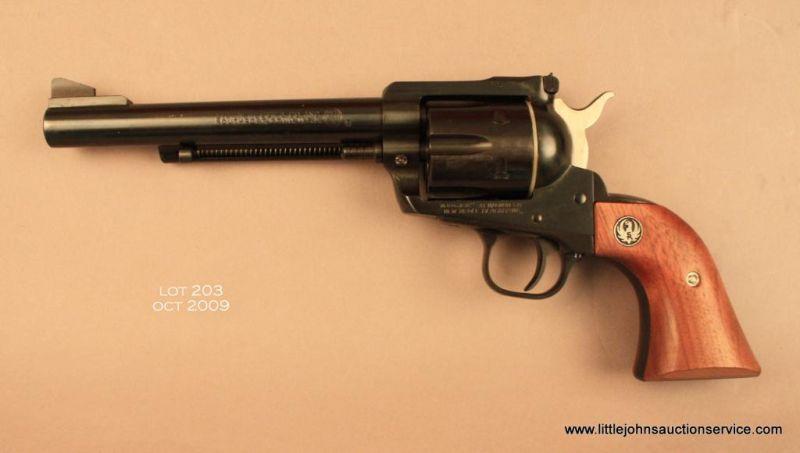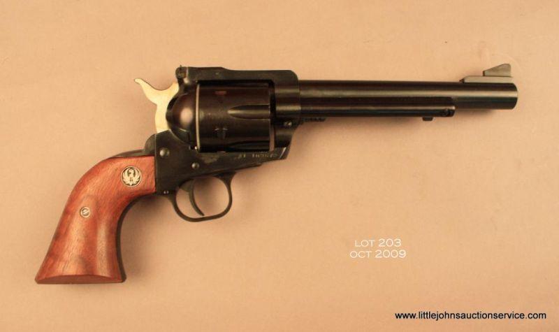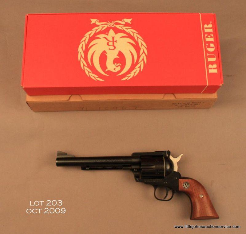 Ruger New Model Blackhawk, #41-10967, .41Mag., 6.5" barrel, blued finish, adjustable sights, smooth wooden grips with medallions. Revolver is in excellent condition overall, and appears unfired. In it's original red Ruger box with allpaperwork. Revolver has a thin layer of grease as shipped from the factory. Est. $200-$400.