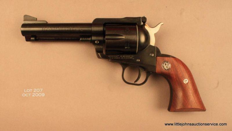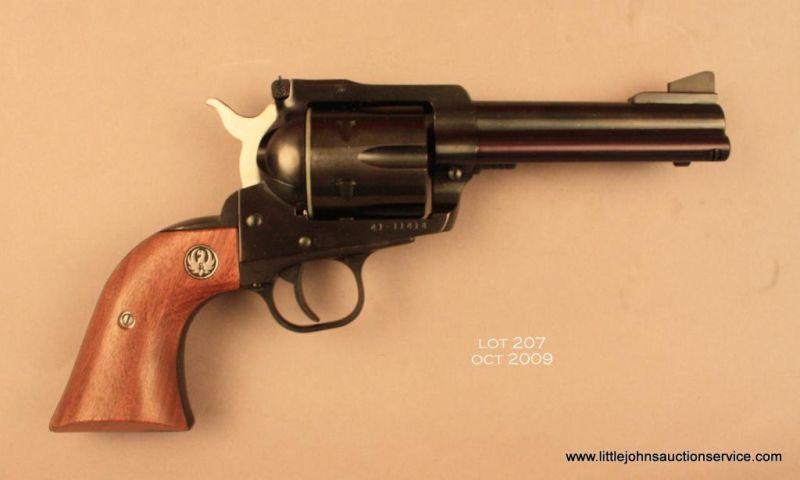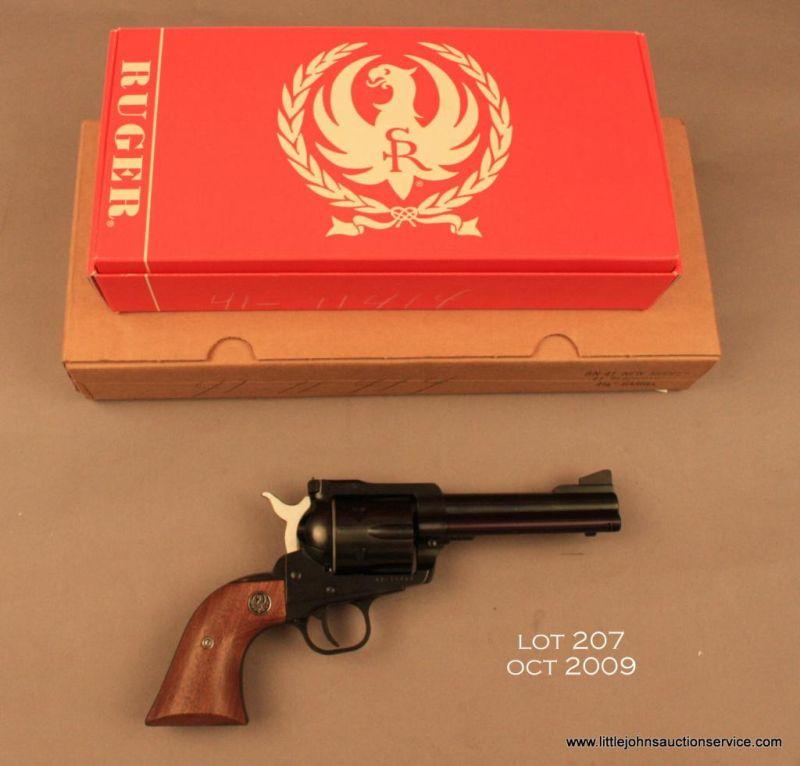 Ruger New Model Blackhawk, #41-11414, .41Mag., 4 5/8" barrel, blued finish, adjustable sights, smooth wooden grips with medallions. Revolver is in excellent condition overall, and appears unfired. In it's original red Ruger box with allpaperwork. Manufactured in 1976, and marked "Made in the 200th Year of American Liberty". Revolver has a thin layer of grease as shipped from the factory. Est. $200-$400.