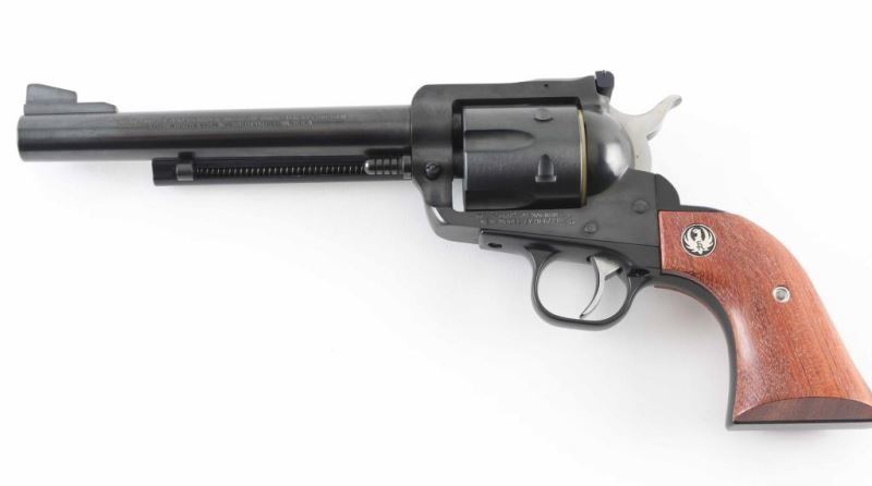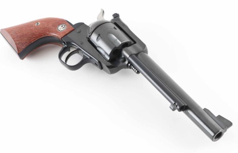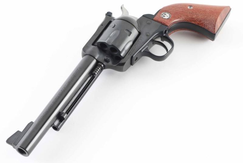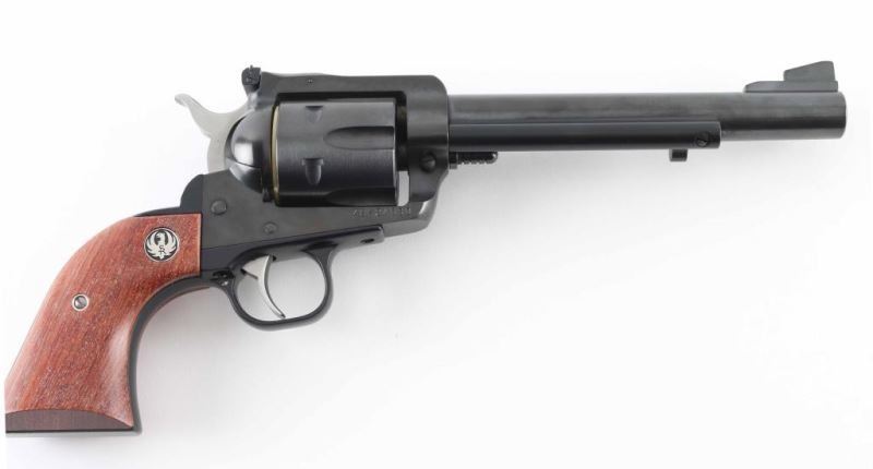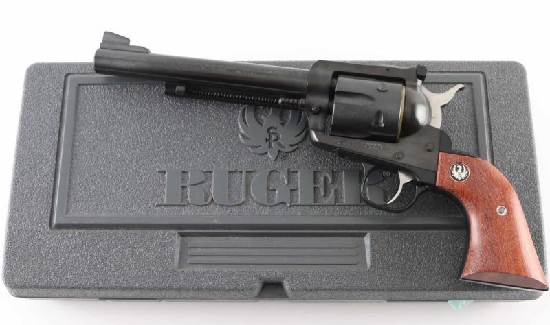 American made single action six-shot revolver chambered in .41 Magnum, circa 2005. Features a blued finish, 6 1/2" barrel, raised ramp front sight, adjustable rear sight, ejector rod, fluted cylinder, smooth wide trigger, serrated hammer spur, transfer bar safety, black anodized aluminum alloy grip frame and two-piece smooth wood grips with Ruger medallions. Revolver exhibits approximately 98%+ of it's original finish showing a very light drag line on the cylinder. action is smooth with good lock-up, the bore is good just needs cleaned and wood grips are fine. Comes with owners manual and original case. Condition is NRA Excellent. Modern Firearm