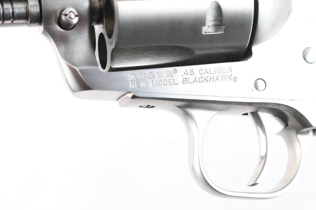 Stainless steel large frame single action revolver chambered in .45 Colt, manufactured circa 1996. Features a brushed finish, 7 1/2" barrel, raised ramp front sight, adjustable rear sight, ejector rod, fluted six-shot cylinder, smooth wide trigger, serrated hammer spur, transfer bar safety and two-piece smooth wood grips with Ruger medallions. Includes a factory hard case with cardboard sleeve with matching label, documents and lock. Revolver exhibits light wear and handling marks. Action is smooth with good lock-up, the bore is excellent/bright and wood grips are fine.