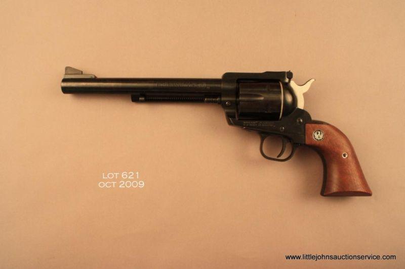 Ruger New Model Blackhawk, #46-21553, .45 ACP, 7.5" barrel, blued finish, adjustable sights, smooth wooden grips with medallions. Revolver is in excellent condition overall, and appears unfired. In its original red Ruger box with allpaperwork. Manufactured in 1976, and marked "Made in the 200th Year of American Liberty". Includes extra 45 LC cylinder. Est. $150-$300.
